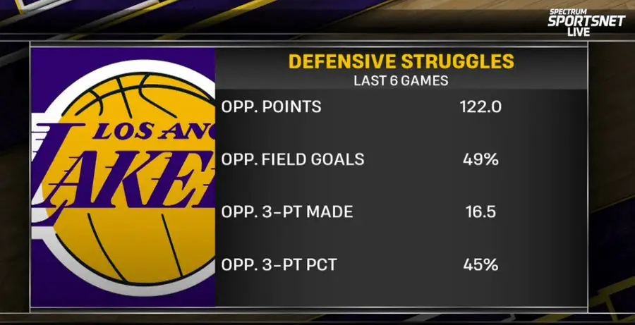 湖人近6场场均失122.0分,对手投篮命中率49%,场均能进16.5个三分,三分