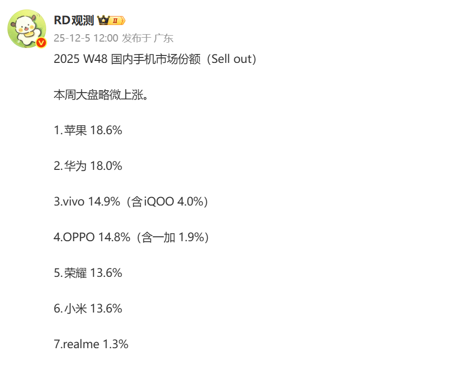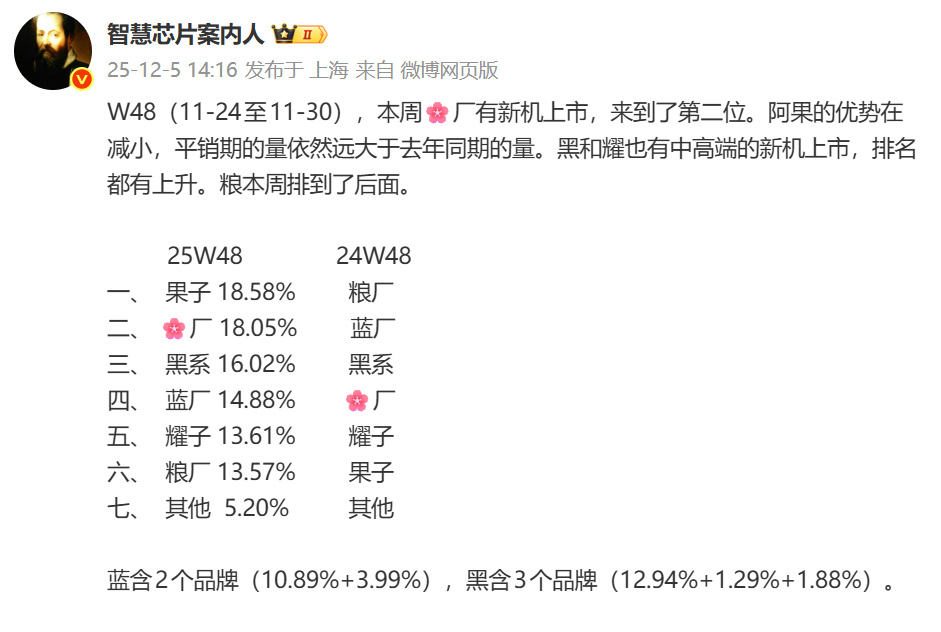 华为重夺国内份额第一 这个数据和数码博主之前公布的对不上,网上说是造假。造假这个其实没有必要,有差距是因为华为新品刚上市,所以会大量铺货。sell in,就是流向渠道的量,在新品上市前会大量铺货,所以这个数值高很正常。而数码博主统计的是sell out,也就是激活量,是渠道流向消费者手中的数据。最后,100% sell out,含梗量还在提升。华为重夺中国手机市场份额第一