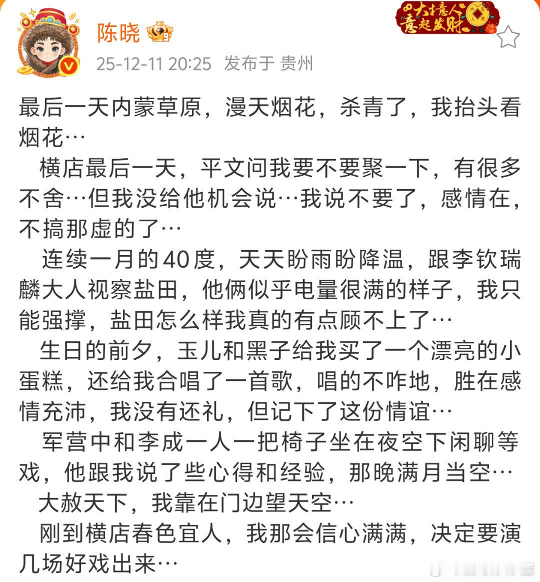 陈晓《大生意人》收官长文:“刚到横店春色宜人,我那会信心满满,决定要演几场好戏出来…”感谢陈晓把如此鲜活的胡平原带到大家面前期待陈晓下一个角色