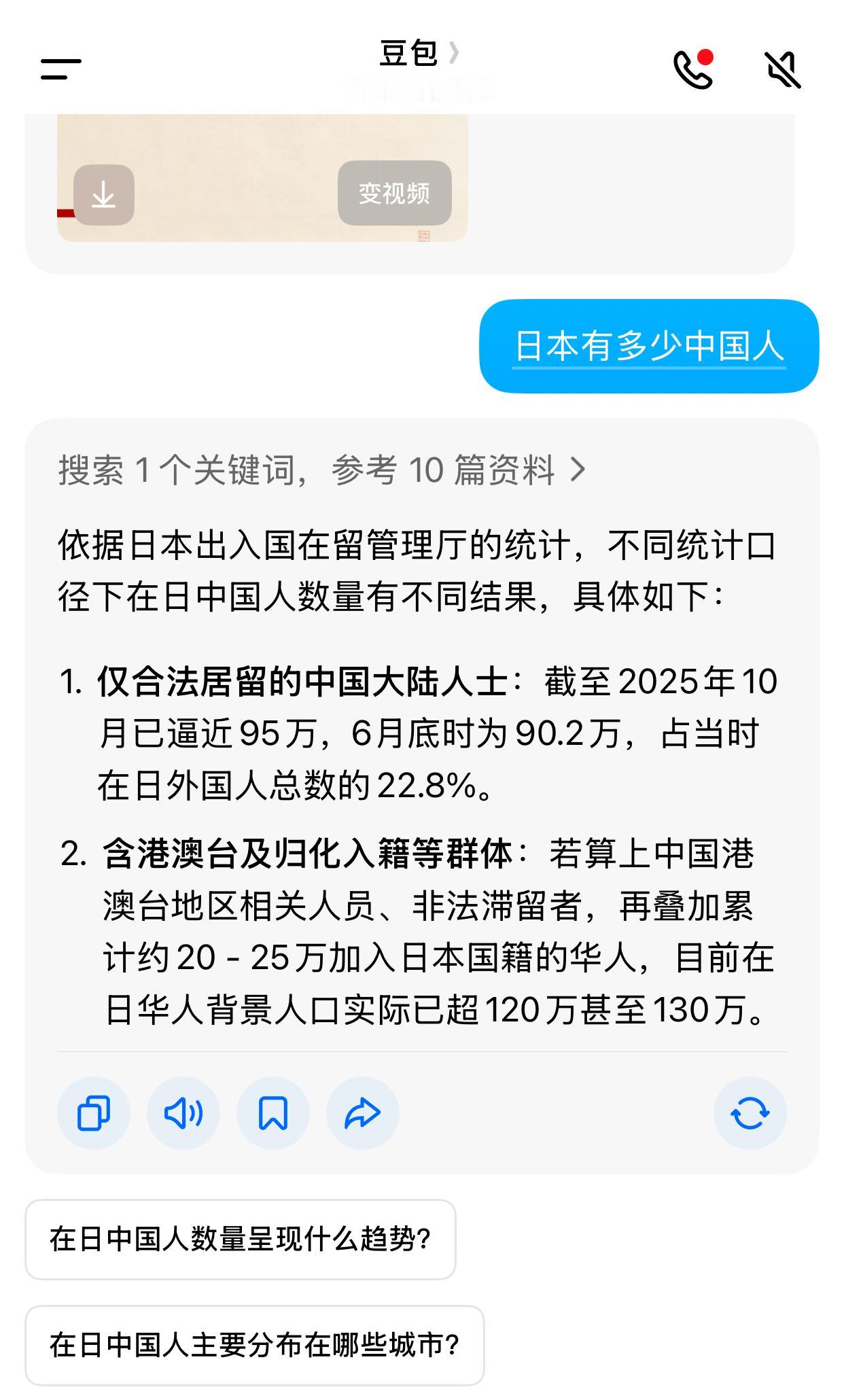 刚刚去问了一下豆包,现在在日本有多少华人?答案是,大约100万吧。日本人口差不多一个亿。也就是说,差不多有百分之一的华人。 中国有多少日本人呢?差不多10万人,其中差不多一半儿在上海。为什么呢?不太清楚。听说,在日本的也是上海人居多。