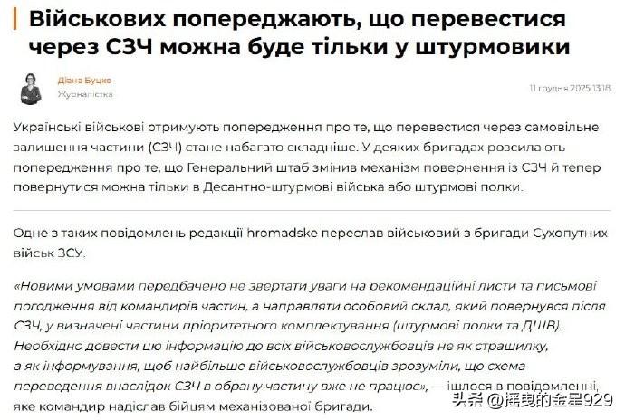 乌克兰媒体报道称,乌军逃兵今后将仅被直接编入突击部队作战,部分乌军旅级单位已经下