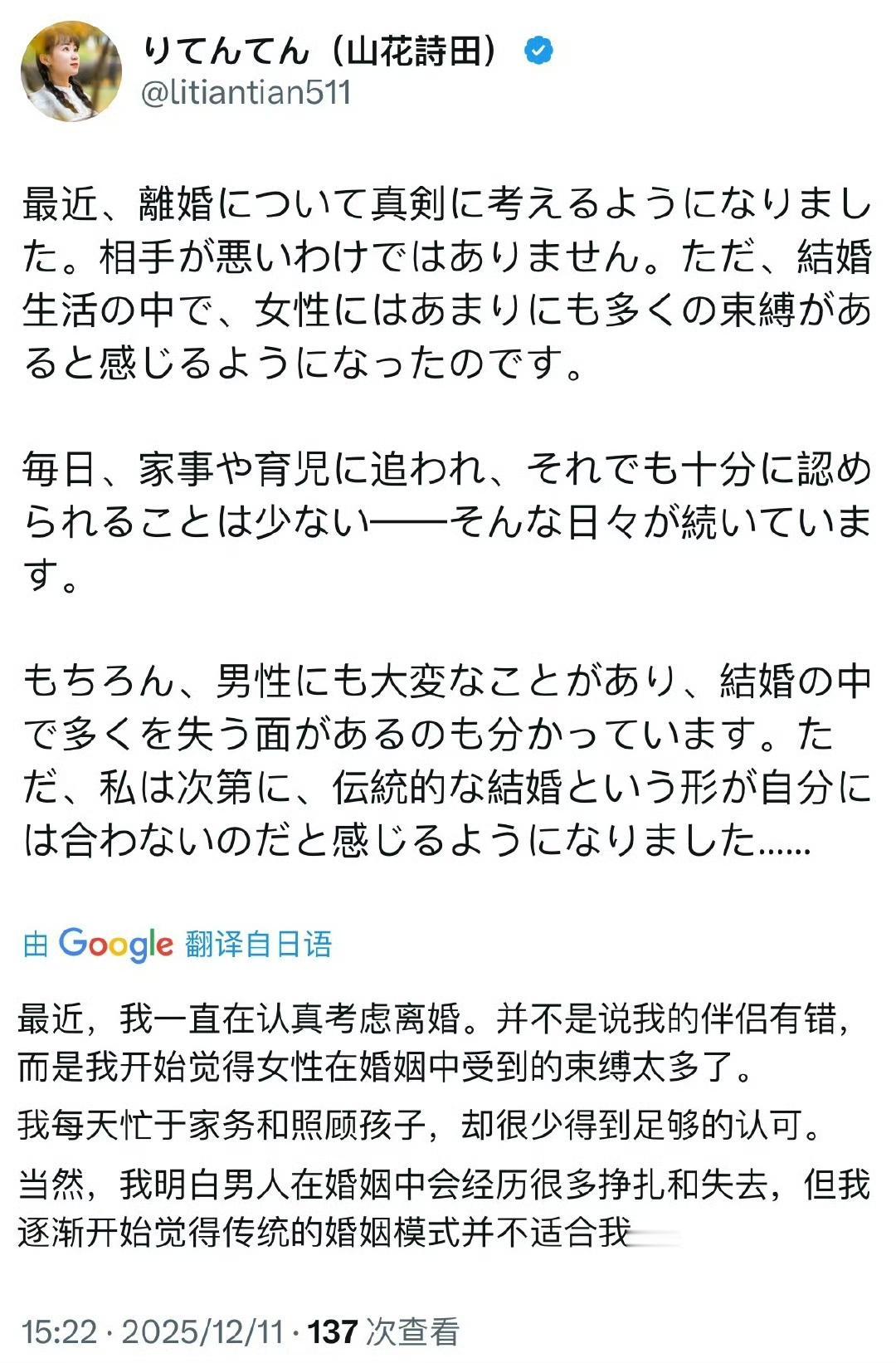 拍完片之后,感觉同样是男人,家里的那位花样怎么那么拉呢?感受到坐公交车的欢乐后,不愿再搭旧单车。 重点在于最后一句,“传统的婚姻不适合我”。意思是老娘要,老娘疯狂要。 她去年就想离婚的老公:我堂堂一个医学博士,跑到日本来刷盘子,累得养不起你娘俩了,早就想让你离开我,去找其他男人。今儿个看来有希望甩开你了。你拍片,我点意见都没有。