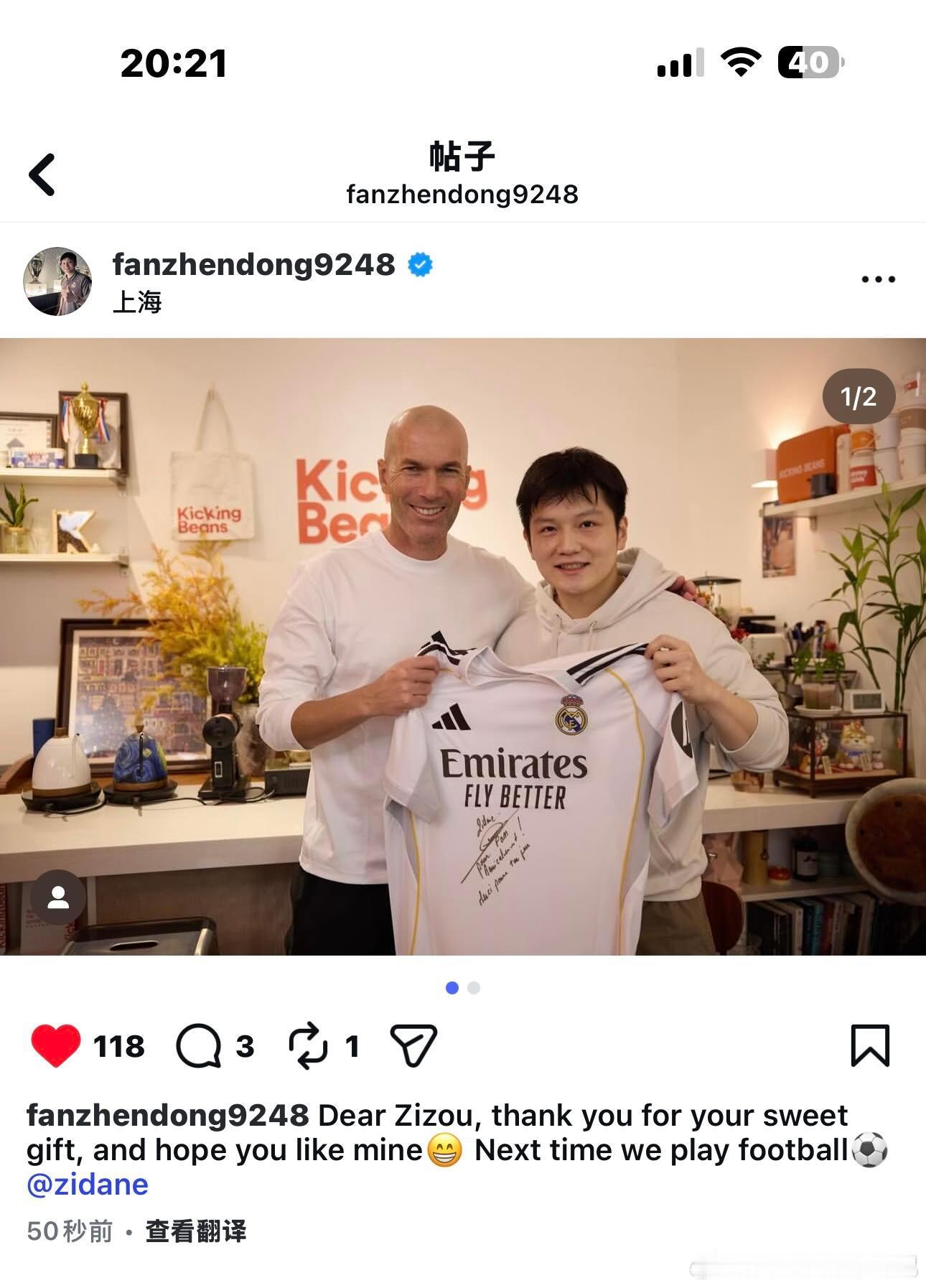 樊振东更新社交平台Dear Zizou, thank you for your sweet gift, and hope you like mine Next time we play football!亲爱的齐祖,谢谢你甜蜜的礼物,希望你也喜欢我的礼物。下次我们踢足球。
