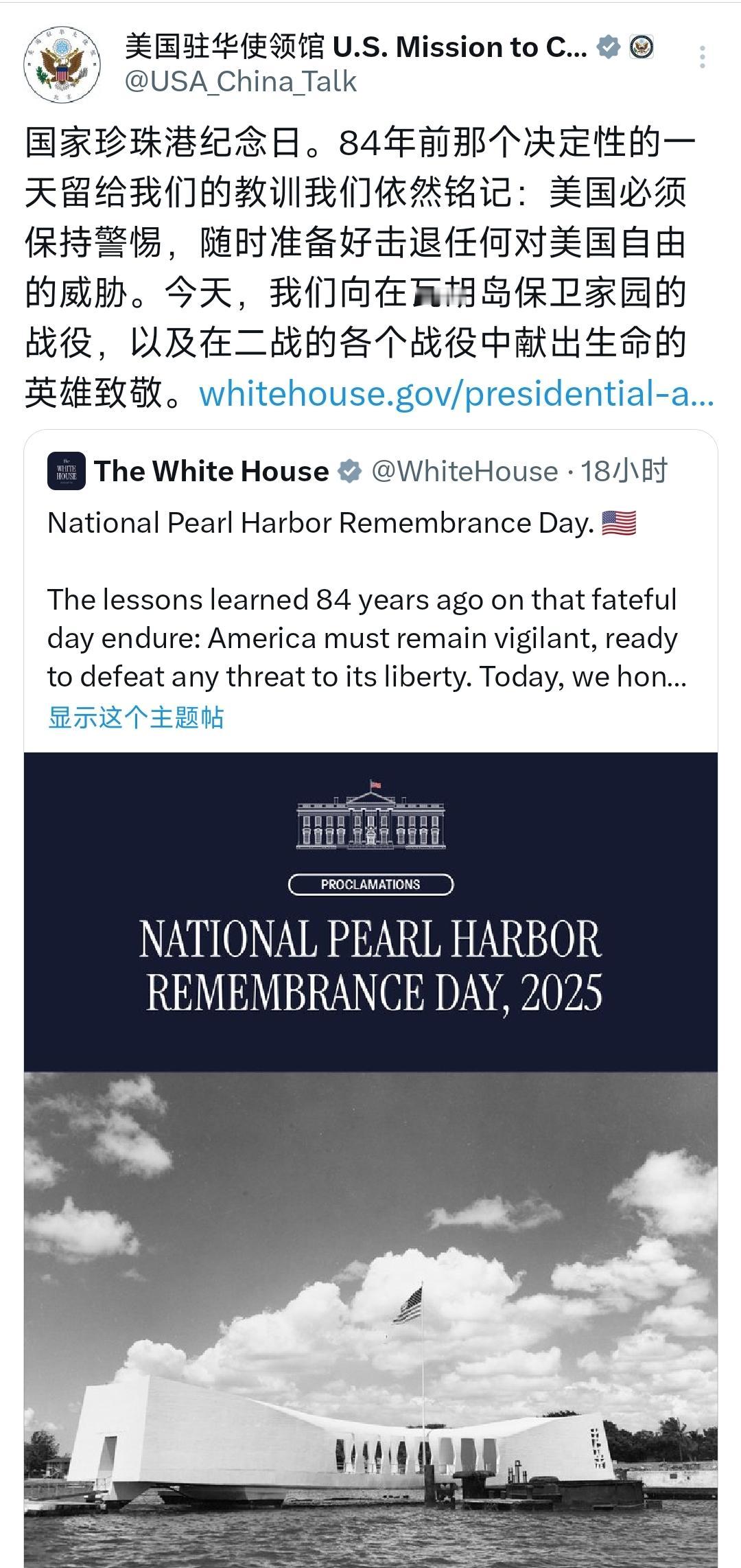 美国宣布了!在12月8日,美国驻华大使馆发文称,“国家珍珠港纪念日,84年前那个决定性的一天留给了我们的教训,我们依然铭记,灭国必须保持警惕,随时准备好击退任何对美国自由的威胁,今天我们向在瓦胡岛保卫家园的战役,以及在二战的各个战役中献出生命的英雄致敬”。 驻华大使馆官网页面上,这段文字旁配着褪色的历史照片——画面里硝烟弥漫的珍珠港战舰,与文字中“击退威胁”的激昂形成微妙对比,只是通篇读罢,始终找不到那个发动袭击的国家名字。 84年前的清晨,日本海军的战机编队呼啸而至,将太平洋舰队拖入战火;84年后的纪念文里,这场悲剧的“导演”却成了隐形人。 为何在纪念“决定性的一天”时,偏偏漏掉了最关键的“谁”? 有人或许会说,纪念本国牺牲者无需提及他国。但历史从不是孤立的片段——当日本政客近年频繁参拜靖国神社,当自卫队舰艇以“出云”“加贺”等旧舰名重新下水,这种刻意的模糊就不再是单纯的“缅怀”。 美国驻华使馆的这份声明,像一面棱镜,折射出更复杂的现实:就在上个月,美日联合军演刚在台海周边落幕,日本防卫省宣布将2024年军费提高至GDP的2%,创下历史新高。 这些动作与“警惕威胁”的纪念口号放在一起,形成了耐人寻味的逻辑闭环——美国需要一个“警惕”的理由来强化同盟,而日本则借“共同威胁”之名加速松绑军事限制。 这种相互需要的背后,是对历史真相的选择性裁剪。当年珍珠港事件的调查报告里,“日本帝国”四个字曾被反复强调;如今的纪念文里,取而代之的是抽象的“威胁”,仿佛那场灾难凭空降临。 更值得玩味的是,美国国务院近期发布的《中国军事与安全发展报告》中,竟将日本称为“维护印太稳定的关键伙伴”。 当“警惕威胁”的警钟为自己而鸣,却对身边正在重蹈历史覆辙的势力递出橄榄枝,这样的“铭记教训”,究竟是在防范风险,还是在喂养风险? 84年前,日本偷袭珍珠港的电报密码被命名为“虎!虎!虎!”;84年后,当美国不断松绑对日本的军事约束,谁能保证这只被喂养的“虎”,不会再次调转獠牙? 历史学者曾指出,二战后美国对日本战犯的部分赦免、对军国主义残余的妥协,为今日的历史修正主义埋下伏笔。 而现在,这种妥协正以“战略伙伴”的名义持续发酵——日本借美国的“印太战略”获得武器出口许可,美国则借日本的军事存在减轻自身防务压力,形成危险的利益共生。 短期看,这或许能为美国在亚太争取更多筹码;但长期而言,当一个从未彻底清算军国主义的国家,重新武装到牙齿,最先感受到威胁的,会是隔着太平洋的美国吗? 那张泛黄的照片里,珍珠港的战舰正在沉没——而今天的文字里,加害者的名字也在沉没。 警惕外部威胁固然重要,但比威胁更可怕的,是对历史的选择性失明。 毕竟,忘记“谁”带来了灾难,比灾难本身更危险。