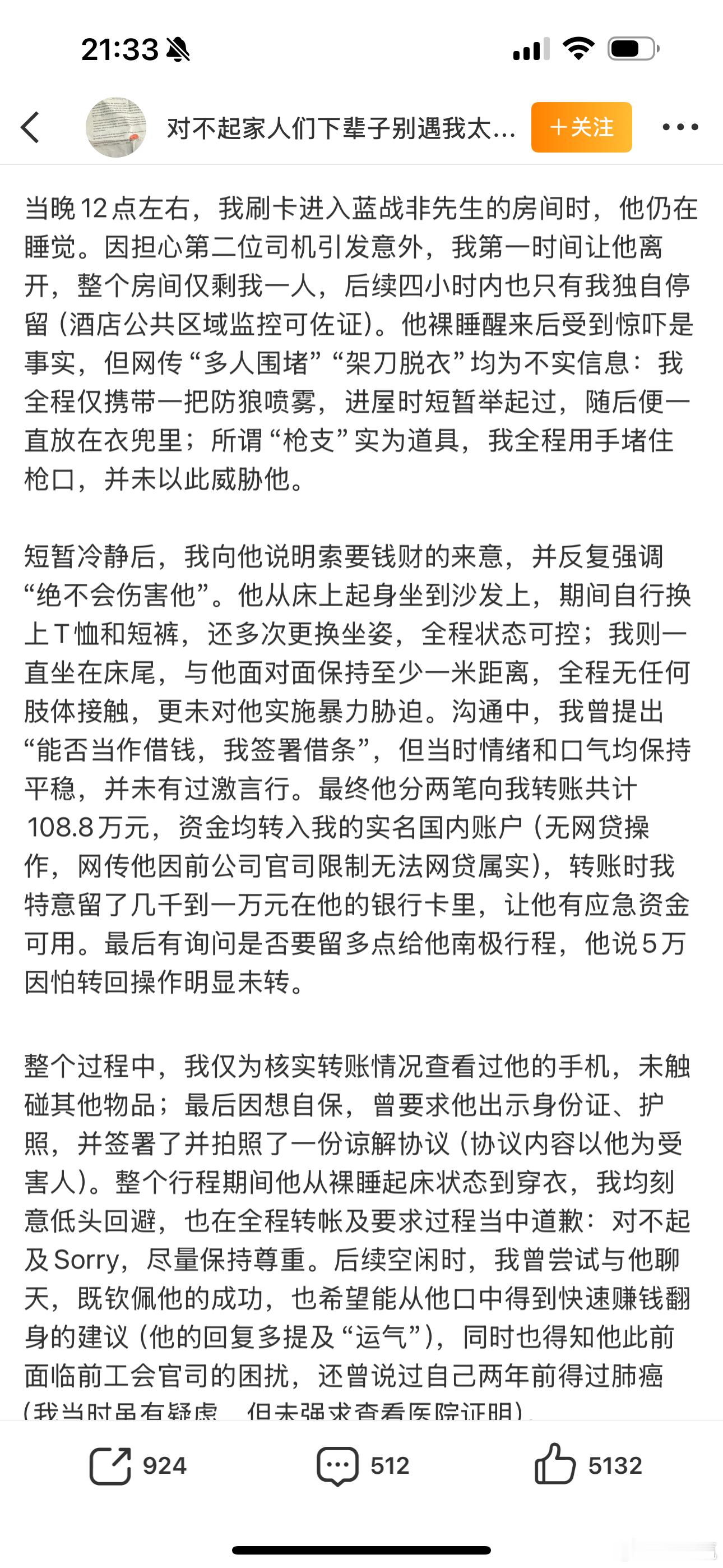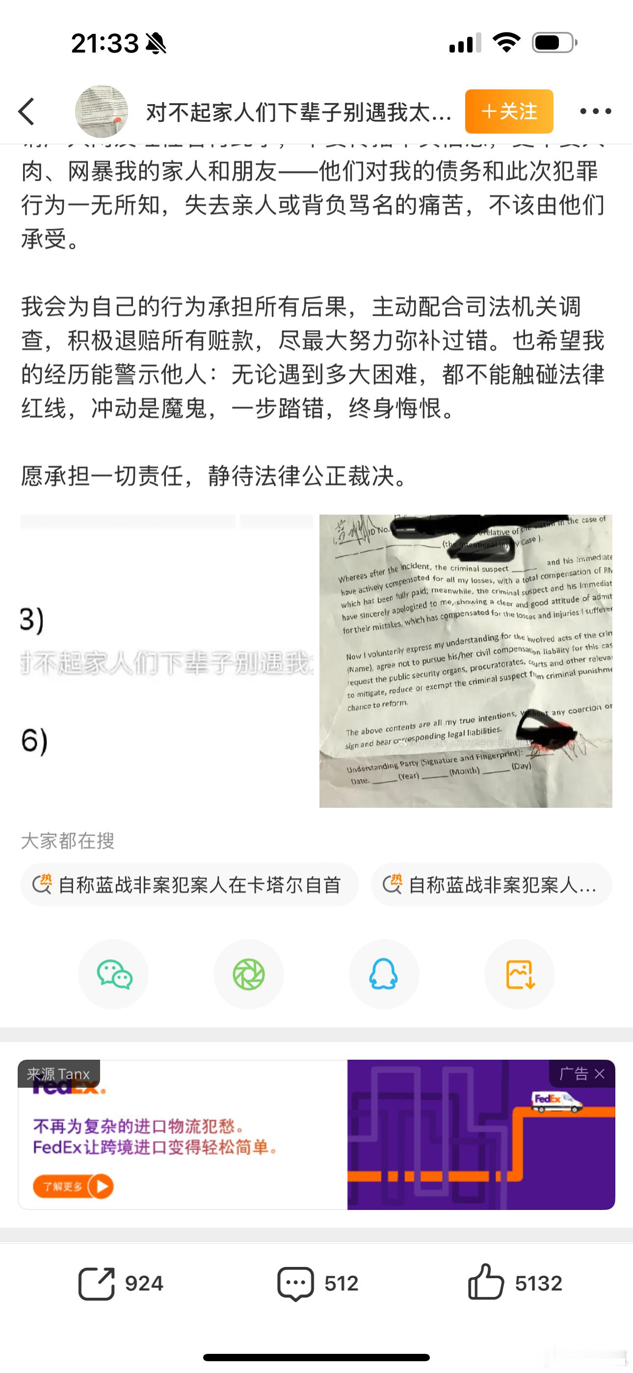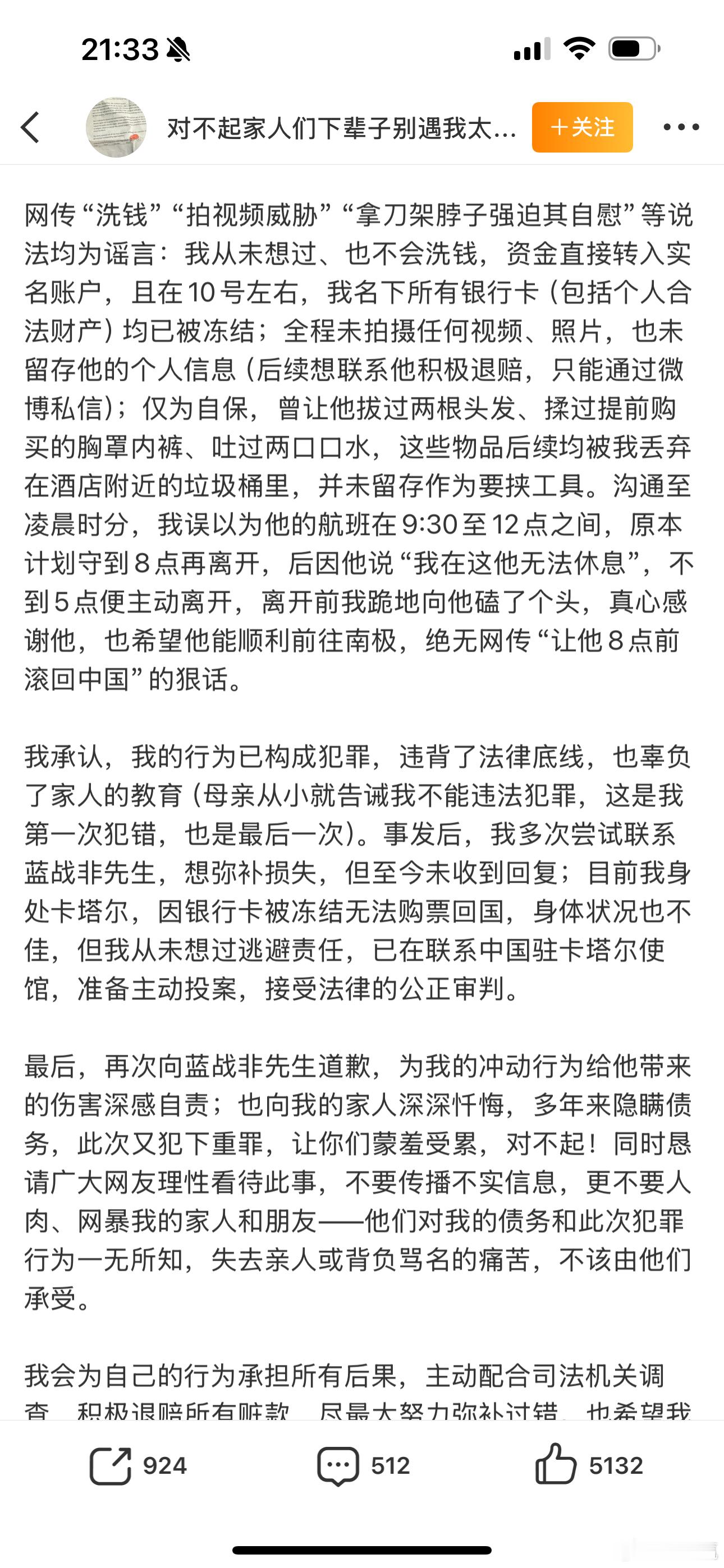 看了一下这个所谓当事人的说法,颇为可信。只是有一点不解,既然干了这种性质恶劣的违法行为,为什么这么快就认罪伏法?难道在行凶之前没有深思熟虑吗?难道不知道这是违法犯罪的行为吗?既然想了又想,下了很大决心要干的事,为什么立马认怂,不符合常理。还是再等等吧,说不定还有反转。自称蓝战非案犯案人在卡塔尔自首