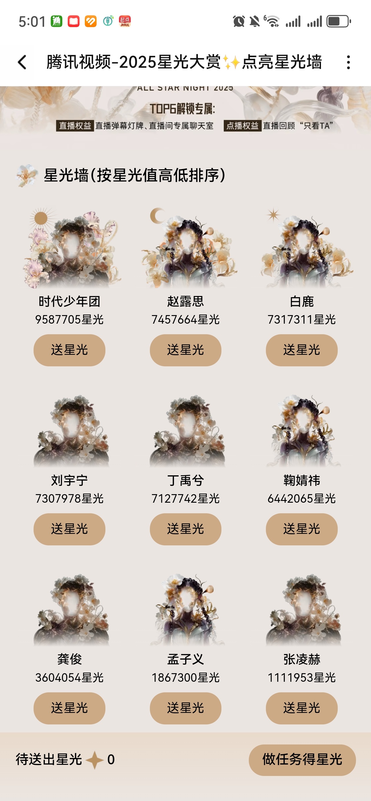 星光大赏的星光墙去年top是刘宇宁今年时团加入投票后感觉会慢慢发力