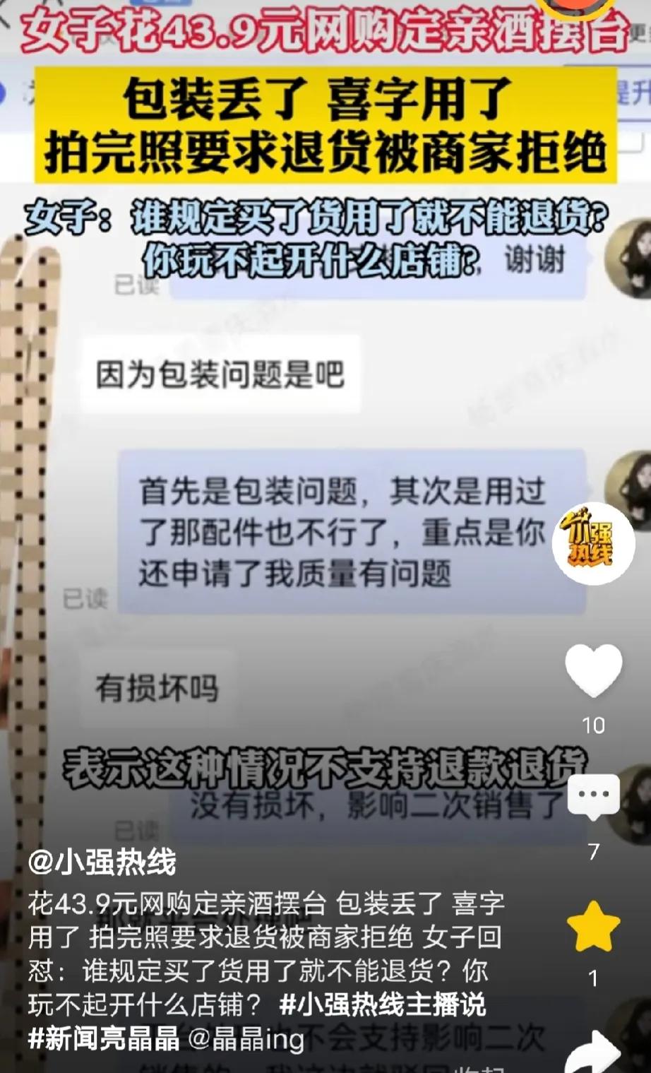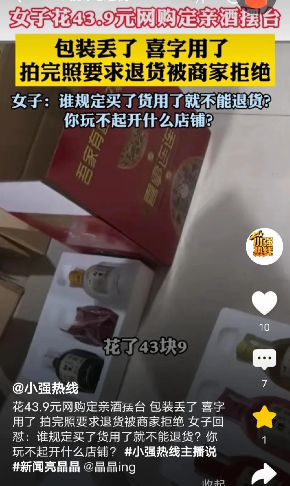 山东潍坊,女子网购5瓶订婚酒摆台,花费43.9元,订婚结束,女子就编造酒质量有问题,要求退货退款,并让商家承担运费,商家收到退货,发现包装、红丝带等均被拆,酒瓶也有使用痕迹,严重影响二次销售,于是拒绝退款。女子气炸了,雇佣他人恶意下单,还多次让他们发布相似差评,故意激怒商家,甚至2次投诉到平台,让商家被罚款600元。商家气不过,把事件发到网上,结局一波三折。    李女士和未婚夫12月初举行订婚仪式,为了把家里布置得漂亮一些。 11月底的时候,李女士就在当地商家王先生的网店购买了5瓶定制款果酒,果酒费用总价43.9元。 商家做得很贴心,不仅在酒瓶瓶身印上喜字、还配了红丝带和礼盒,另外在发货时还附赠了一些赠品。 因为酒瓶是玻璃材质,商家还特意用了防损包装,就是确保李女士收到货时,能完好无损。 谁料,李女士在订婚结束后,觉得酒留着也没用,她就打算把酒退了,可是看看那包装都拆了,她担心商家拒绝退货。 李女士于是就编了个理由,说酒不好喝,质量有问题,要求退货退款,还让商家承担费用。 一开始,王先生同意了她退货,可当他收到货后一看,发现酒瓶已经开封,送给她的各种配件也不见了,另外包装还破损了,已经严重影响二次销售。 所以,王先生拒绝了李女士退款的要求。 李女士见退款被拒绝,瞬间火冒三丈,质问商家,有损坏了吗? 商家回复她有使用过的痕迹,影响二次销售,所以没办法退货退款。 李女士回怼,是谁规定买了货用了就不能退了,你这样说,买你家货就不能退呗,你玩不起开什么店铺? 双方争执不下,李女士直接绕过商家,投诉到平台。 平台最终扣除李女士3.7元包装费,将40.2元退款给她。 商家对这个处理结果十分不满,便将事件经过发布到网上。李女士看到后,双方矛盾进一步升级。 她给商家发信息,表示要陪商家慢慢玩,除非他不开这个店。 之后更是雇佣他人恶意下单,还让他们发布相似的差评,故意惹怒王先生。 王先生看了更气,双方的矛盾再次升级,李女士又以商家的严重态度问题投诉到平台,平台因此罚款王先生300元。 再之后,王先生在私信后台收到了很多消息,他因为回复消息,语言用得不当,又被平台罚款300元。 王先生在网上表态,这被罚的600元权当给李女士的‘订婚份子钱’ 后续,网友根据地域信息扒出李女士是某小区物业工作人员,还发现她曾以同样方式退货订婚服;其初中同学也爆料她上学时就爱占小便宜。 12月9日商家透露,警方因涉案金额过低无法立案,平台仅返还300元罚款,李女士还向市监局投诉商家营业执照、报警称被“网暴”。 商家无奈表示剩余300元罚款当“份子钱”,并计划每天发视频维权。 那么,李女士主张无理由退货是否符合法律规定? 《消费者权益保护法》第25条规定,经营者采用网络、电视、电话、邮购等方式销售商品,消费者有权自收到商品之日起七日内退货,且无需说明理由,但消费者退回的商品应当完好。 本案中,李女士购买订婚酒用于摆台后,酒瓶开封、配件丢失、包装破损,已超出“查验和确认商品品质”的合理范围,不符合“商品完好”要求。 她主张无理由退货违背该法条立法初衷,商家有权拒绝退款,平台扣除部分包装费后退款的处理未充分考量商品破损情况,未完全维护经营者合法权益。 李女士的系列行为是否构成民事权利滥用? 《民法典》第132条规定,民事主体不得滥用民事权利损害国家利益、社会公共利益或者他人合法权益。 本案中,李女士明知商品已使用影响二次销售,仍编造质量问题退货,被拒后雇佣他人恶意下单、发布差评。 两次投诉导致商家被罚款,其行为并非正当行使消费者权利,而是滥用退货权、投诉权损害商家经营权益,扰乱网络购物秩序,违反诚实信用原则,构成民事权利滥用,应承担相应民事责任。 李女士获得的退款是否属于不当得利? 《民法典》第985条规定,得利人没有法律根据取得不当利益,受损失的人可以请求其返还不当利益。 李女士使用涉案果酒完成订婚摆台后,通过不实投诉获得40.2元退款。 她在商品已贬值且无合法退货依据的情况下取得退款,属于不当得利。 商家因商品无法二次销售、被平台罚款产生财产损失,与李女士的不当得利存在直接因果关系,商家有权要求李女士返还退款并赔偿部分罚款损失。 说到底,这事儿里李女士的操作确实不地道,借着消费者的身份钻空子,不仅坏了市场里的诚信规矩,还让商家平白受了损失、添了堵。 法律给了消费者维权的底气,却不是用来“占便宜”的工具,像这种滥用权利、恶意折腾商家的行为,既违背情理,也踩了法律的边线。 希望这事能给更多人提个醒,不管是买家还是卖家,都得守规矩、讲诚信,别想着耍小聪明钻漏洞。 也盼着平台和监管能更公平处理,不让老实人吃亏,让这种“薅羊毛”的行为真的付出代价,这样网购环境才能干净舒心。