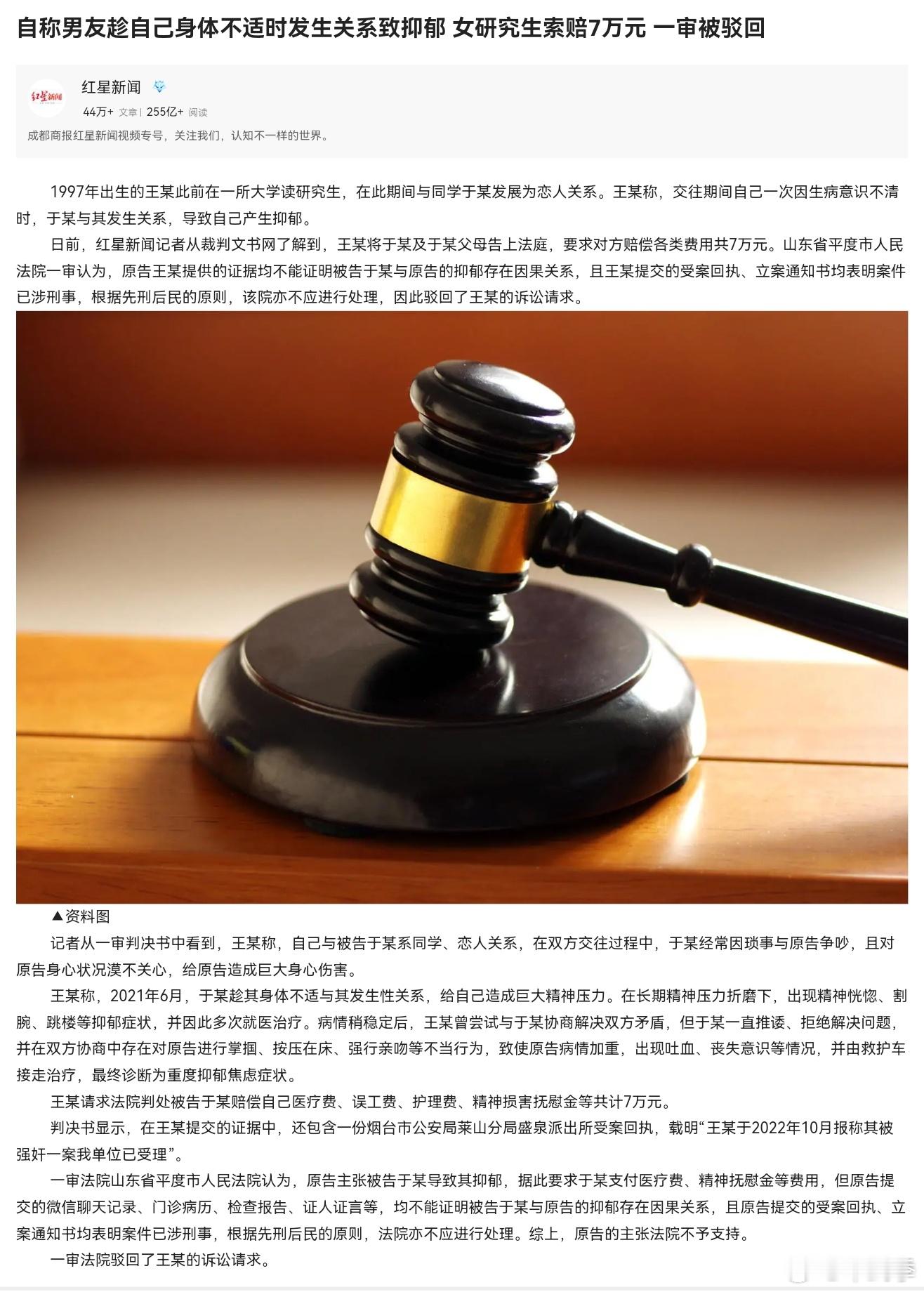 自称男友趁自己身体不适时发生关系致抑郁,女研究生索赔7万元,一审被驳回