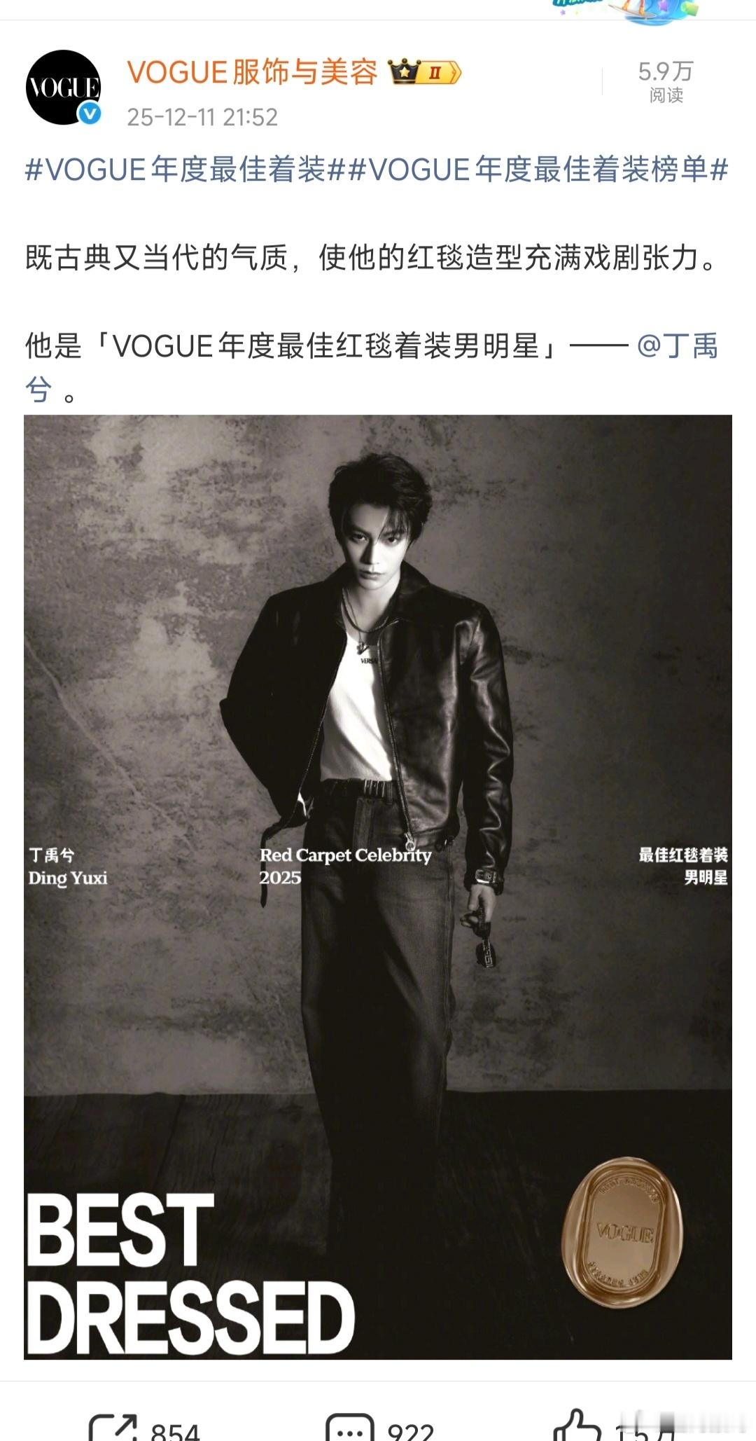 丁禹兮凭借今年9月底去米兰时装周的看秀造型,获得「VOGUE年度最佳红毯着装男明