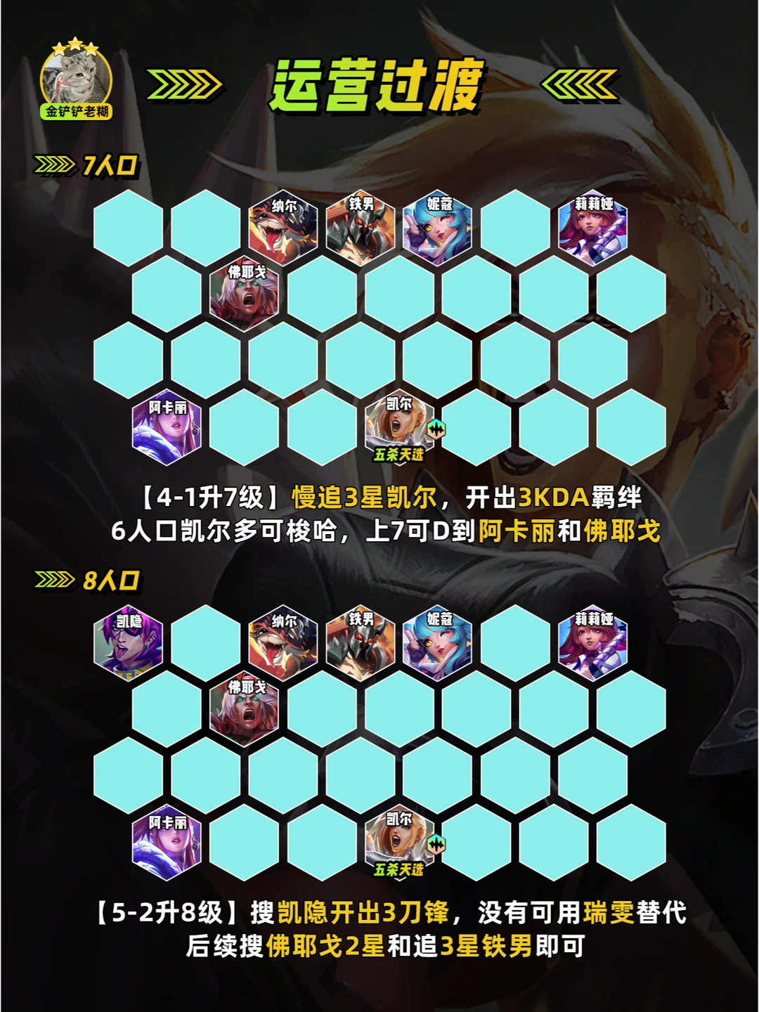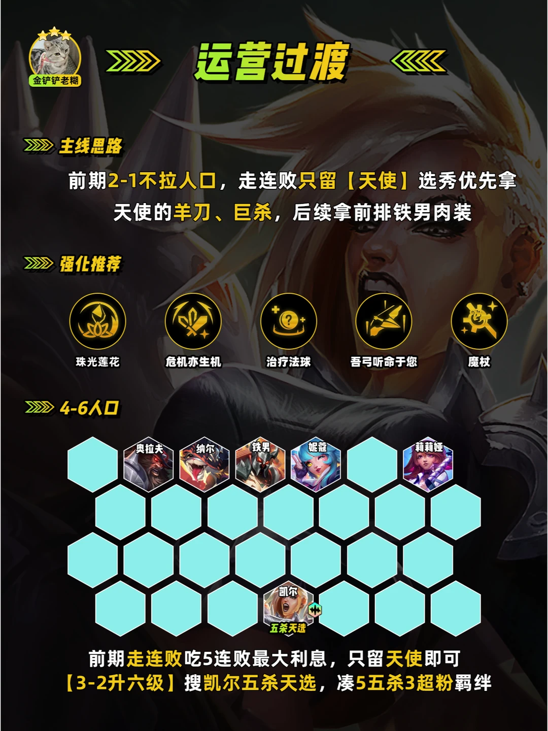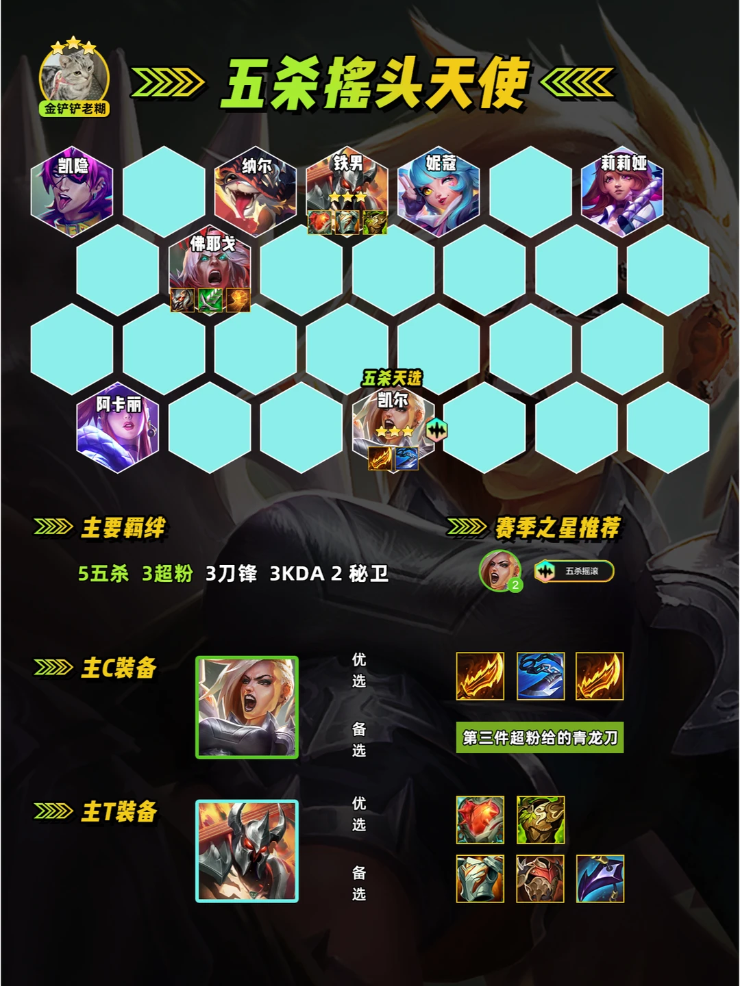 [哇R]五杀摇头天使 (金铲铲丨阵容丨新赛季丨攻略丨代码分享) 5.0攻速极致快感,五杀爆炸输出,天使再度登神! [买爆R]阵容介绍: 天选双羊刀天使的极限攻速,配合五杀的伤害增幅,暴打当前热门阵容。 [黄金薯R]整体思路: 前期连败吃最大利息,6级大D找凯尔五杀天选, 之后拉7慢追3星,铁男尽量也3星,后续存钱上8开补凯影即可! [doge]城邦及符文: 优先羁绊专属符文,其次吸血类。战力类优先于经济类。