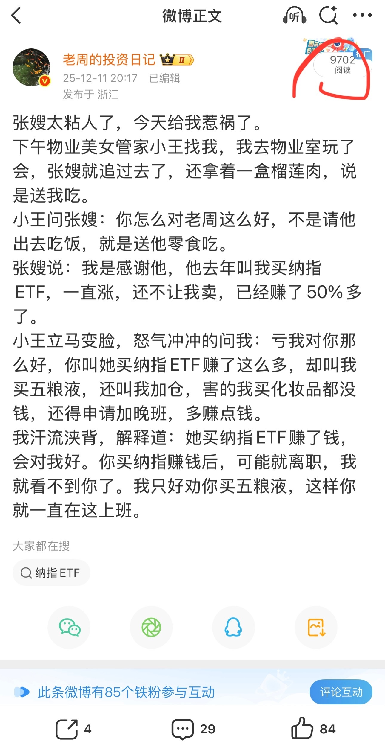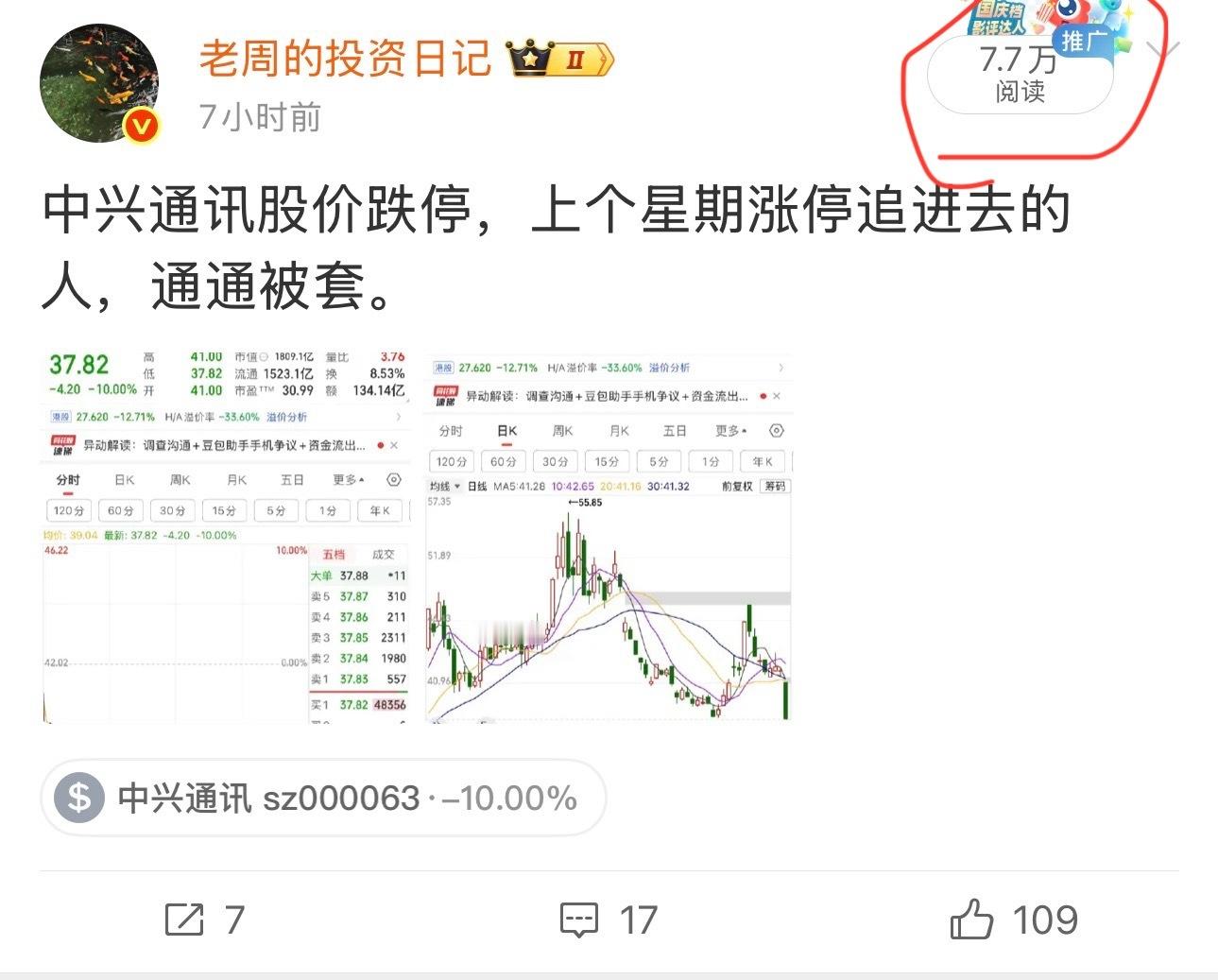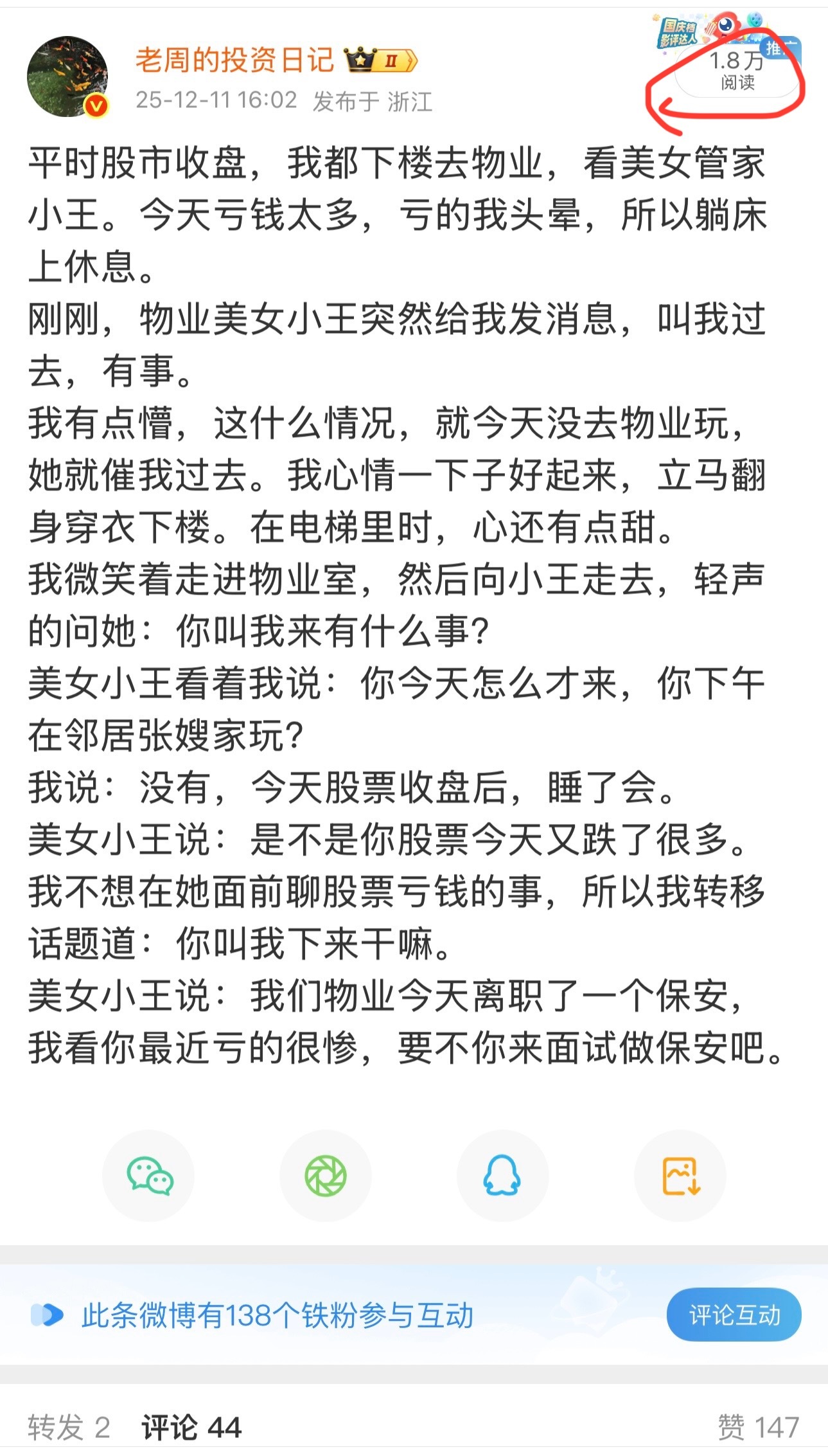 写开心的情感小作文,阅读量是很少的,图一下午写的那篇,阅读量1.8万,图二晚上写的目前阅读量九千多,这是因为刚发,两万阅读量肯定没问题,我自己都转发了几次评论。但看看图三,我花两分钟,一句话,阅读量就7.7万。微博喜欢热门,喜欢明星这类的文章。写小作文,是我的爱好,我有时散步,想到一个点子,就存在脑子里,股票一跌,难受,就写篇开心的小作文。