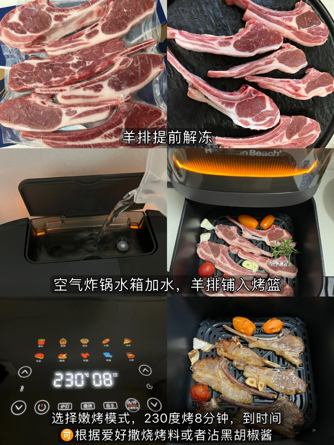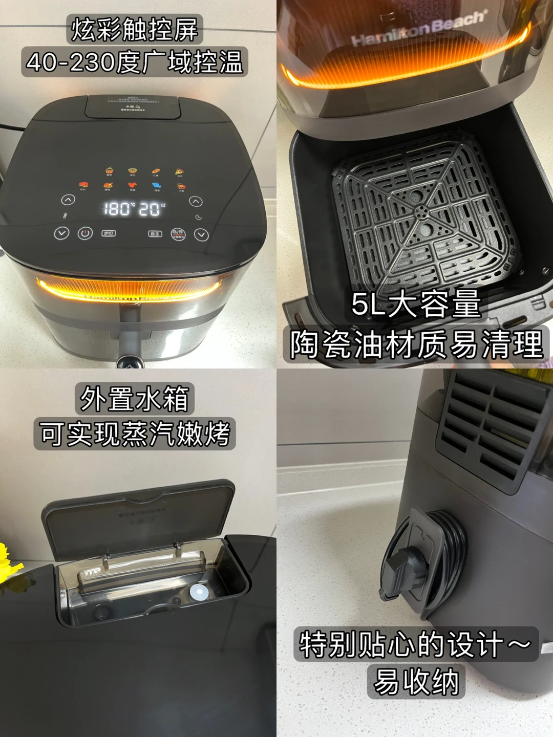晚饭打卡~ 🥢嫩烤战斧小羊排 🥢香辣烤鹌鹑蛋 🥢蓝莓山药 🥢干煸豆角 🥢水果拼盘 不得不说现在的厨房小家电也越来越卷了,汉美驰这款空气炸锅最吸引我的地方就是它能实现蒸汽嫩烤,外置水箱烤出来的羊排肉质鲜嫩不干柴,40-230度的控温范围适用于更多食材的烹饪。我家之前的烤箱总是觉得小,稍微多一些的食材就要烤两次,这个5L的大容量满足了我们一家人日常需求~外观除了拥有酷炫的呼吸灯光环以外还有贴心的小细节,设计了绕线圈,收纳起来更加方便~我真是太满意了!