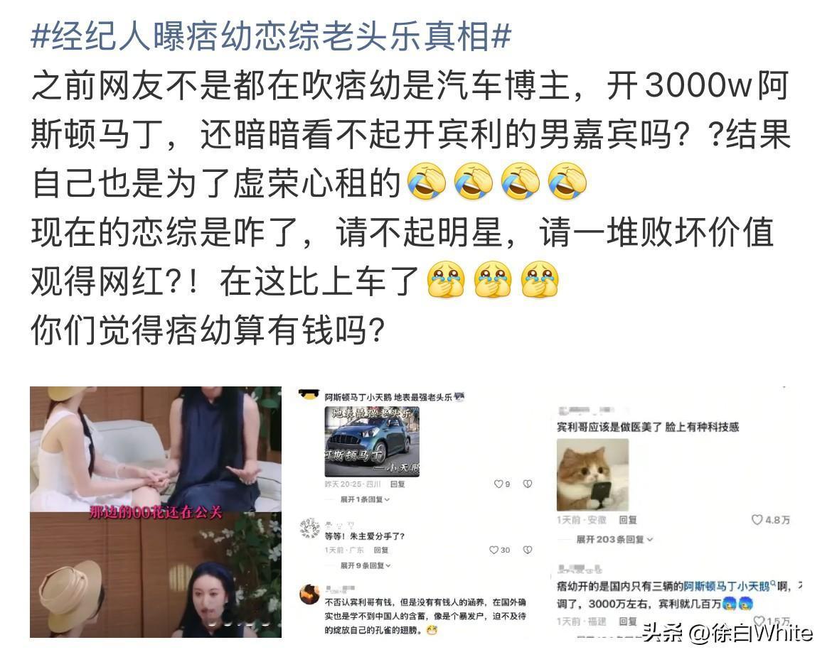 12月11日,千万网红参加恋综,租千万豪车亮相,结果其他恋综嘉宾一个都没认出来,还被开百万宾利的男嘉宾贴脸炫耀! 网红参加恋综说不为流量为寻真爱,这事有几个人信她说的是真的?反正我是不信的! 与其说单纯为寻找真爱,不如说流量下降了,在有助于工作,给自己增加热度的情况下,顺便上上恋综,看看有没有自己适合的男嘉宾,谈段恋爱,更加真诚,增加路人缘 现在路人缘不升反降,就有这个缘故!