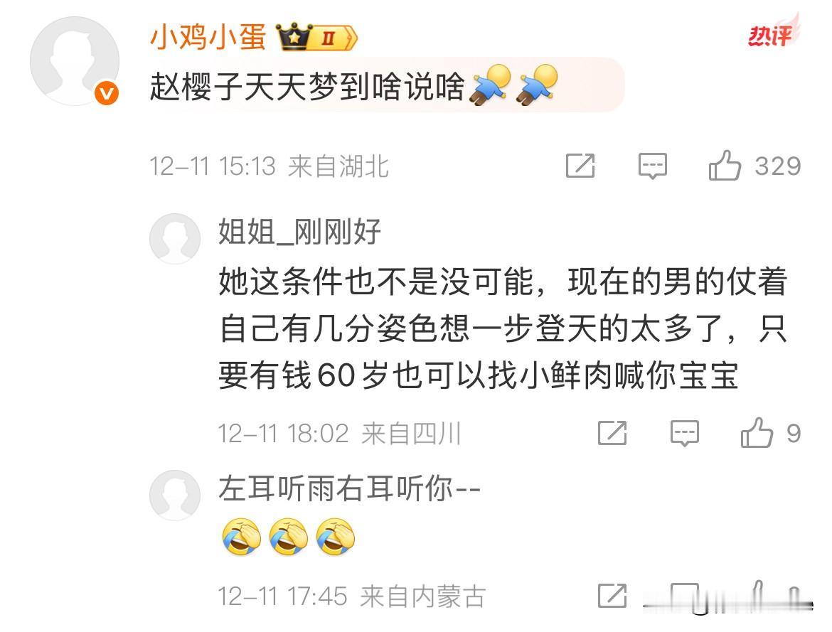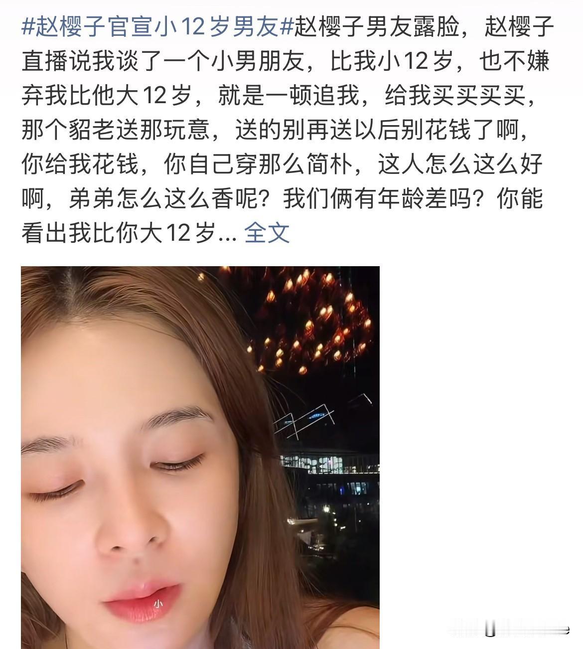 12月11日,赵樱子官宣小12岁男友! 张口就是对方不嫌弃自己年纪比他大12岁,男方穿着简朴,还老爱送她皮草,多么好! 感觉大家都知道她嘴里没实话大概率是假的,但大家就爱凑这个热闹,把她拱上了热搜! 赵樱子之前也算是观众古早都市情感剧里的白月光女主,如今各种谈“过往”给自己谈世俗了,大家从把她当女神,到把她当小品演员,知道她的话不可信,纯当小品看!