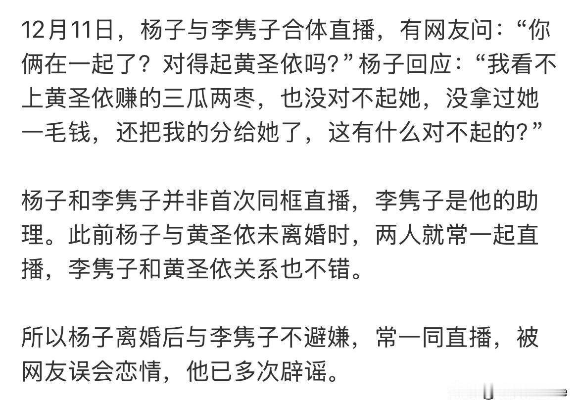 12月11日,杨子带李隽子直播,被网友质问,你们在一起了么?对得起黄圣依么? 杨子理直气壮回复网友,对得起黄圣依,早在今年年中杨子就带李隽子回家了,李隽子还与杨子妈妈手拉手合照,对外杨子是一直否认跟李隽子的恋情,只说她是自己的助理 在杨子没跟黄圣依分开前,李隽子就是杨子的助理了,在我看来,反正两个人都分开了,杨子爱跟谁在一起就跟谁在一起,随他