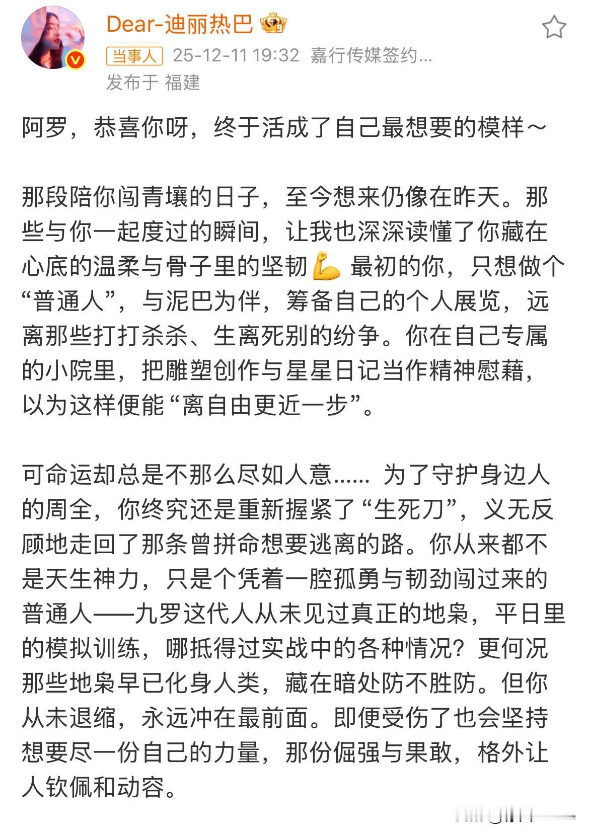 12月11日,迪丽热巴长文告别枭起青壤! 这部剧期待了2年,播出后反而没看完! 不是因为它剧情不好看,也不是因为迪丽热巴的演技有问题,而是它呈现出来的感觉,与我想象中的风格存在很大偏差! 我原以为它会是类似于《司藤》的感觉,但前几集看下来有点让人摸不着头脑,于是我把它放下了,打算播完再看!今天看到迪丽热巴发文,我想我该重新继续看下去了!