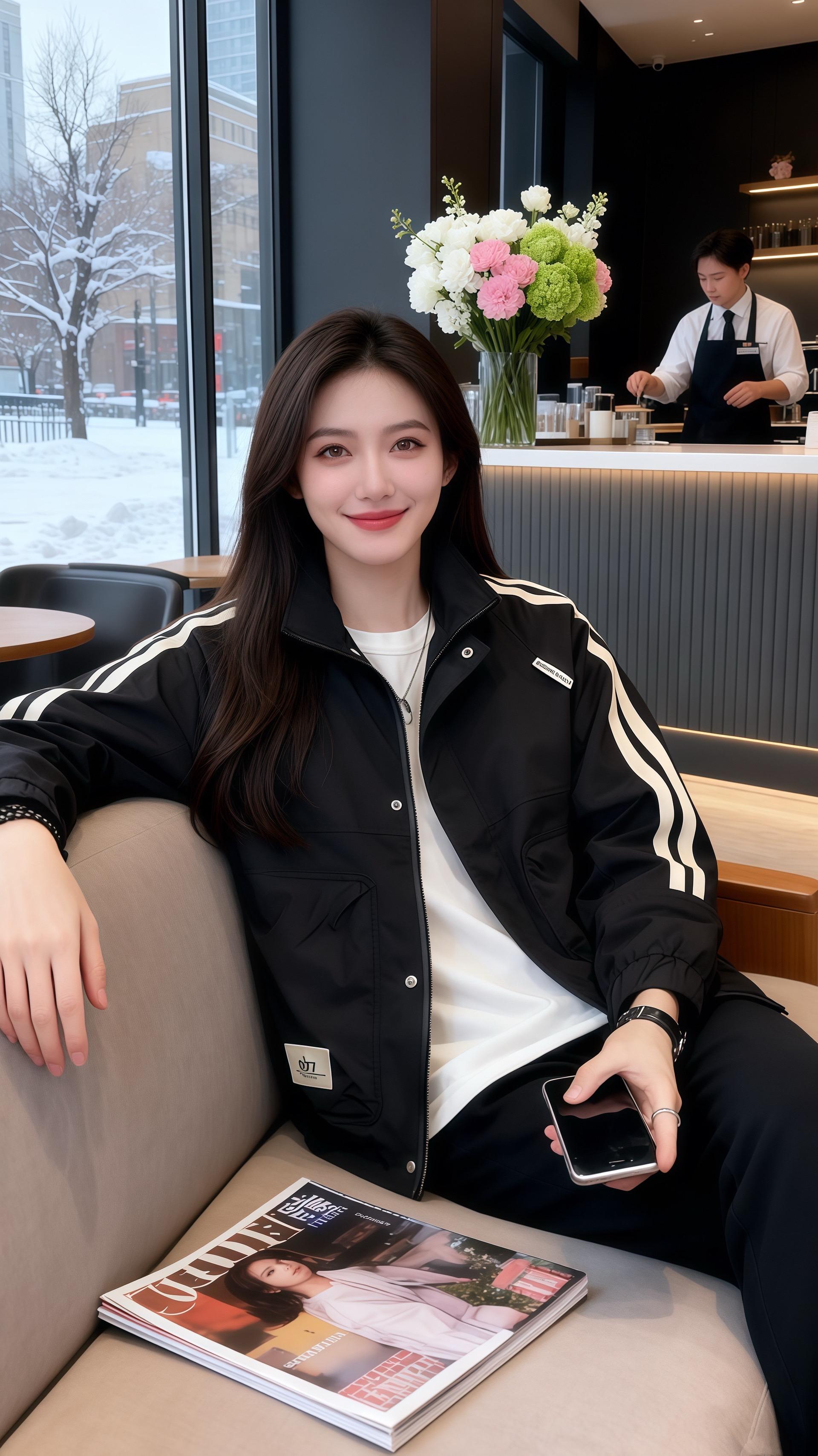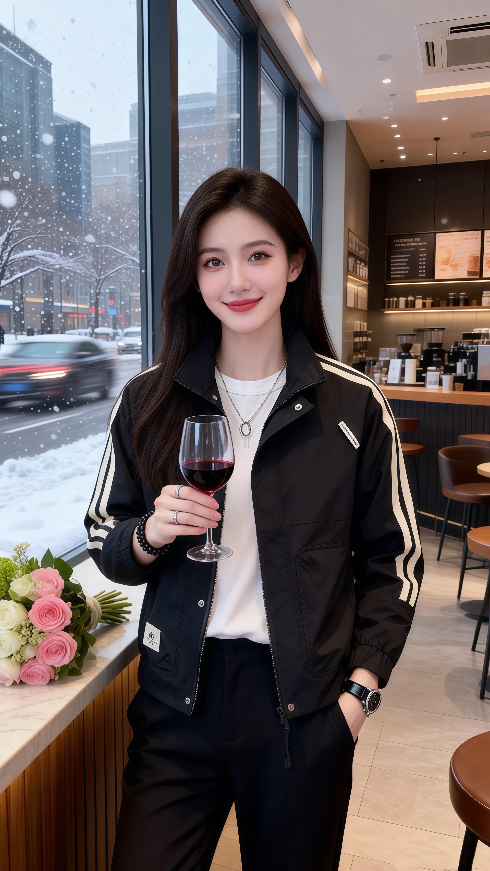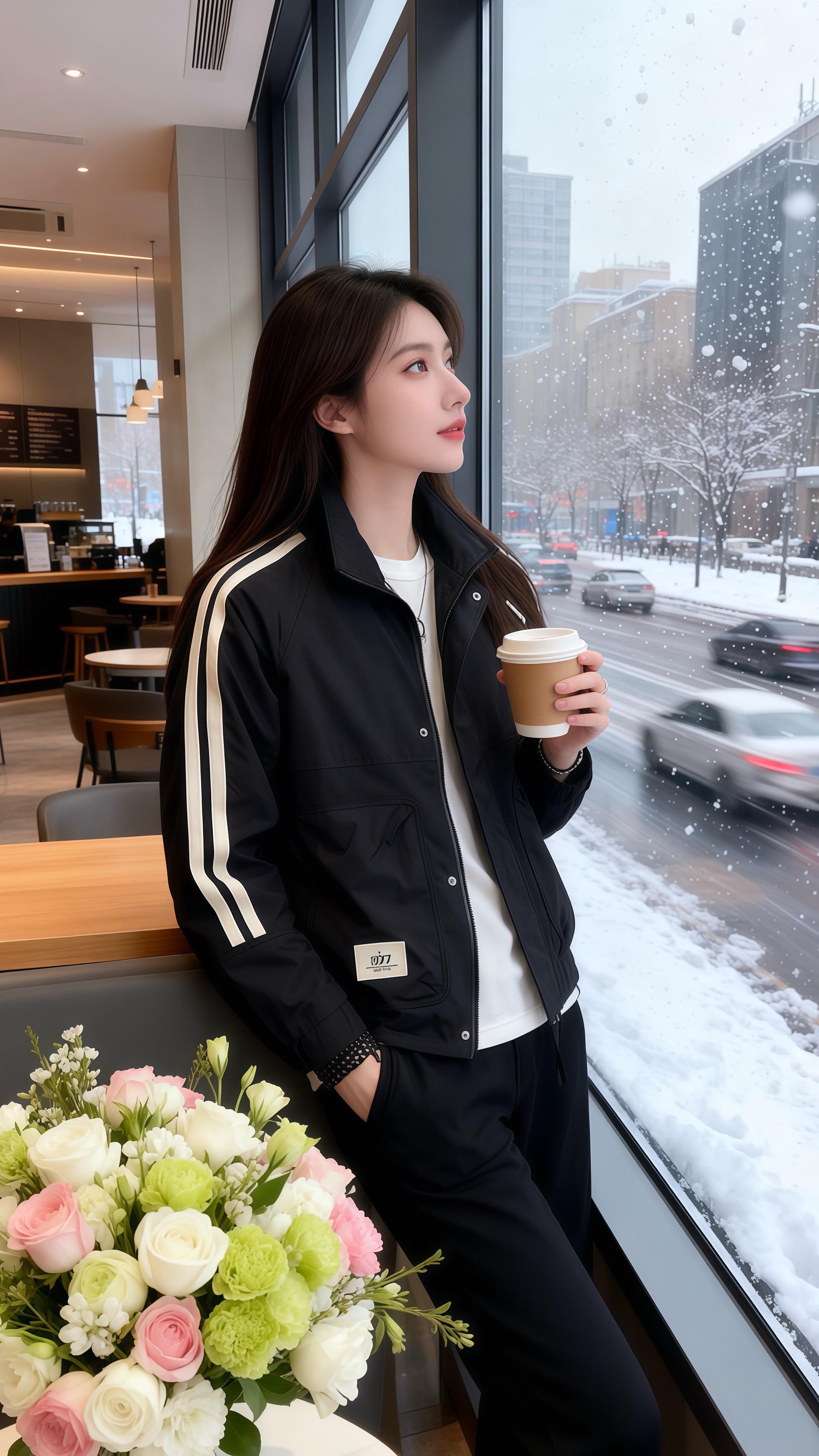 她穿黑色立领短外套,面料带着顺滑的哑光质感,袖子上的白色条纹撞色亮眼,给沉稳的黑调添了几分灵动,衣身的小标与贴袋设计,让简约的版型多了细节感。内搭白色圆领打底衫,干净的白与沉黑相互映衬,衬得气质愈发清爽;下配黑色长裤,裤型挺括却不生硬,和外套的休闲风格呼应,整身穿搭像冬日里的黑巧克力,醇厚的黑糅合着白的清甜,连桌旁的花束都成了柔和的衬景。