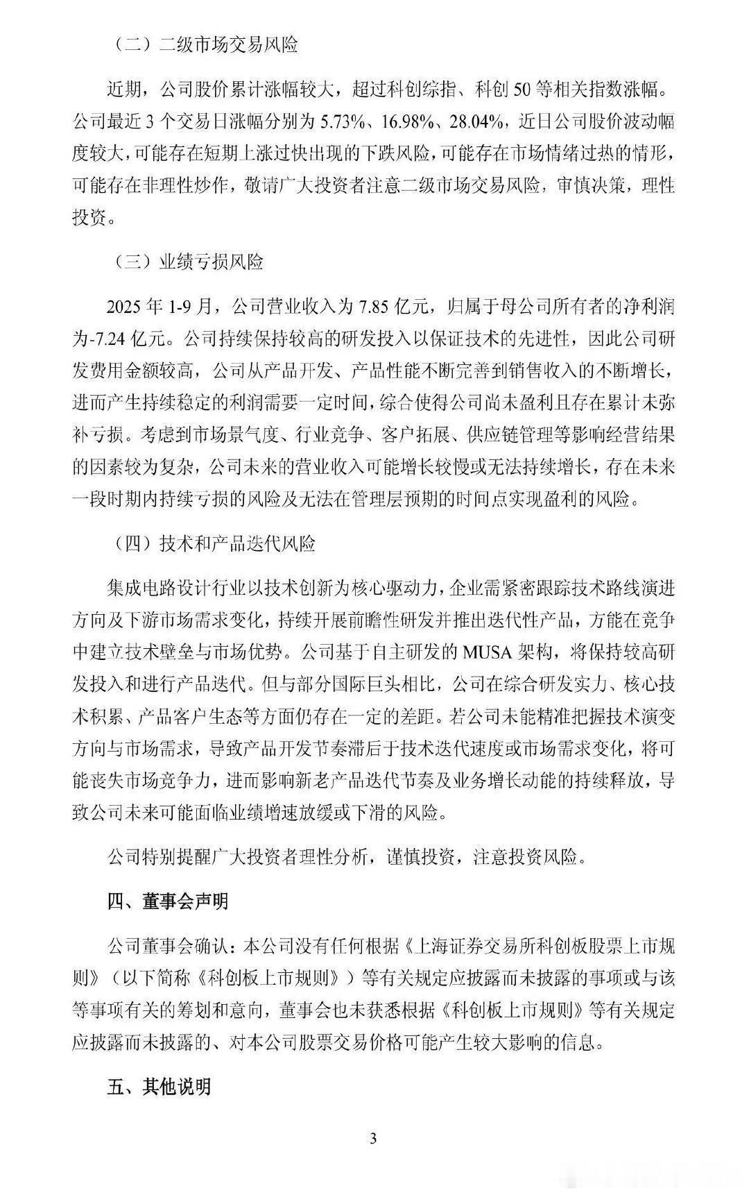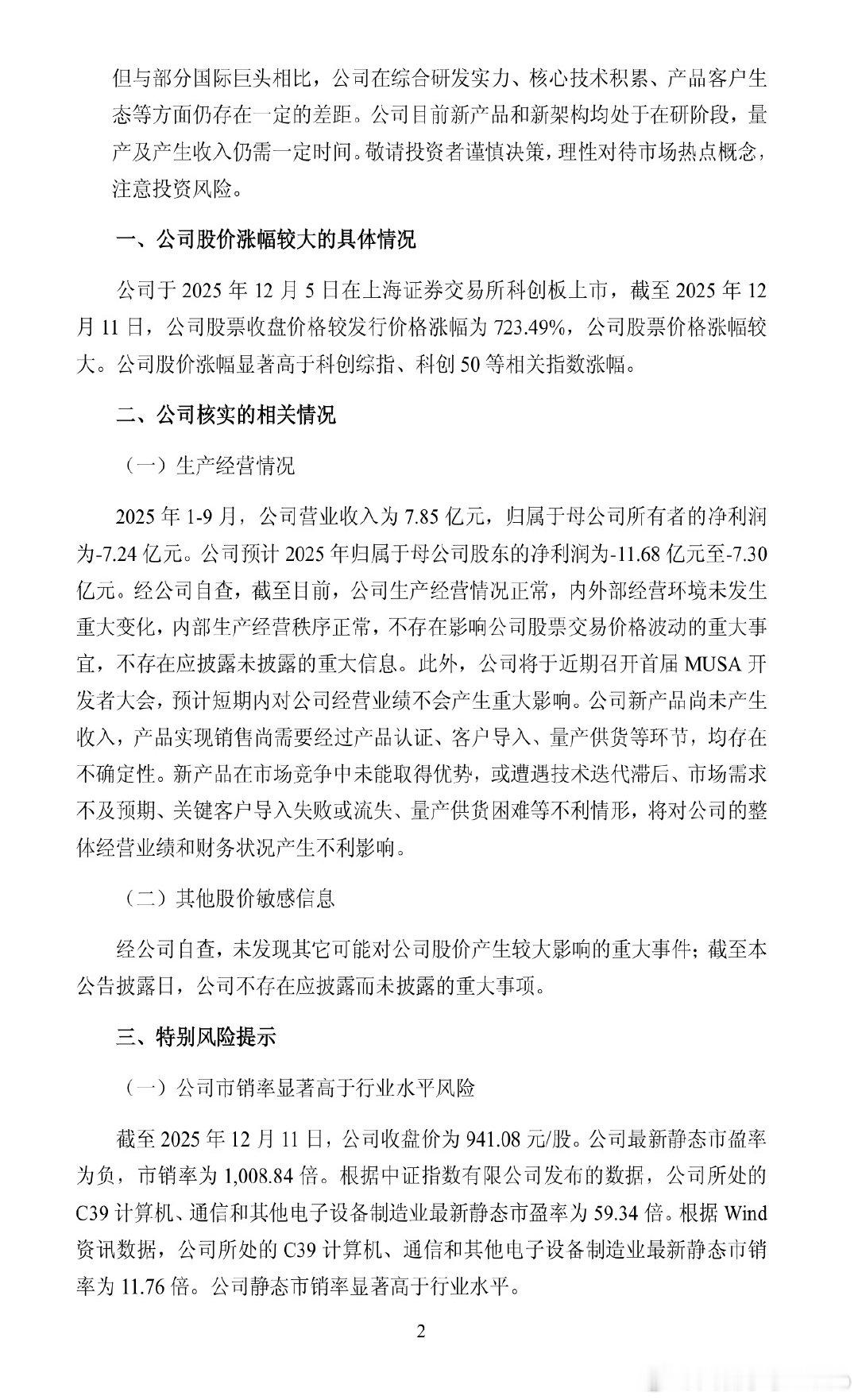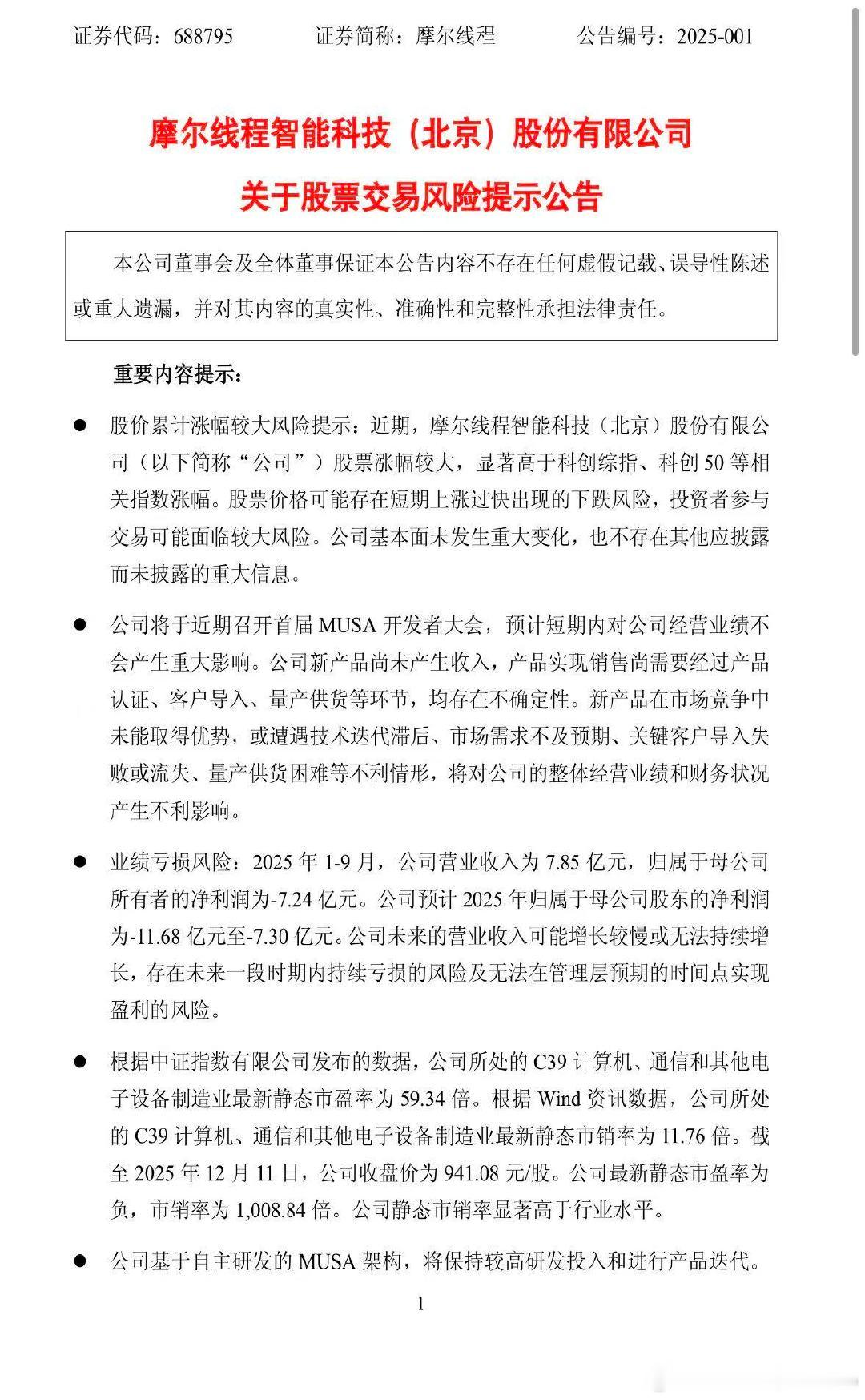 【摩尔线程公告】摩尔线程提示风险 12月11日,摩尔线程(688795.SH)公告称,公司股票价格涨幅较大,显著高于相关指数涨幅,可能存在短期上涨过快出现的下跌风险。公司将于近期召开首届MUSA开发者大会,预计短期内对公司经营业绩不会产生重大影响。公司新产品尚未产生收入,产品实现销售尚需要经过产品认证、客户导入、量产供货等环节,均存在不确定性。新产品在市场竞争中未能取得优势,或遭遇技术迭代滞后、市场需求不及预期、关键客户导入失败或流失、量产供货困难等不利情形,将对公司的整体经营业绩和财务状况产生不利影响。公司基于自主研发的MUSA架构,将保持较高研发投入和进行产品迭代。但与部分国际巨头相比,公司在综合研发实力、核心技术积累、产品客户生态等方面仍存在一定的差距。公司目前新产品和新架构均处于在研阶段,量产及产生收入仍需一定时间。(财联社)