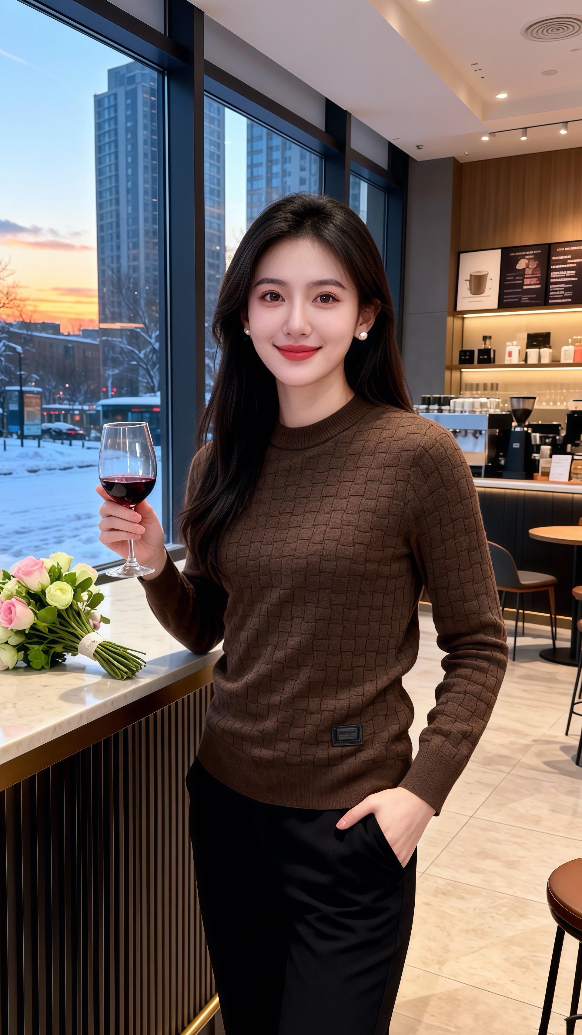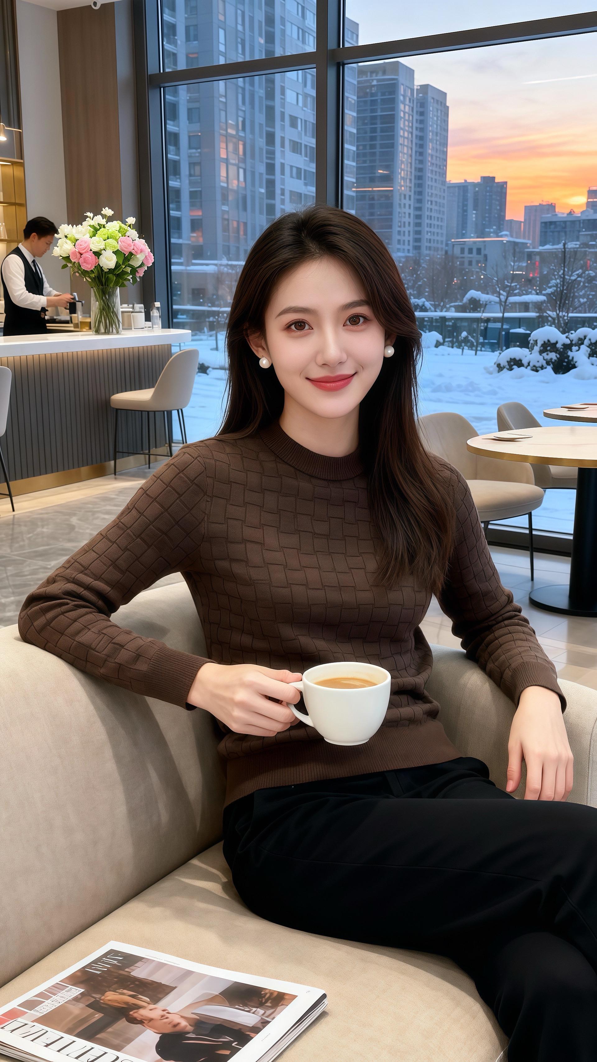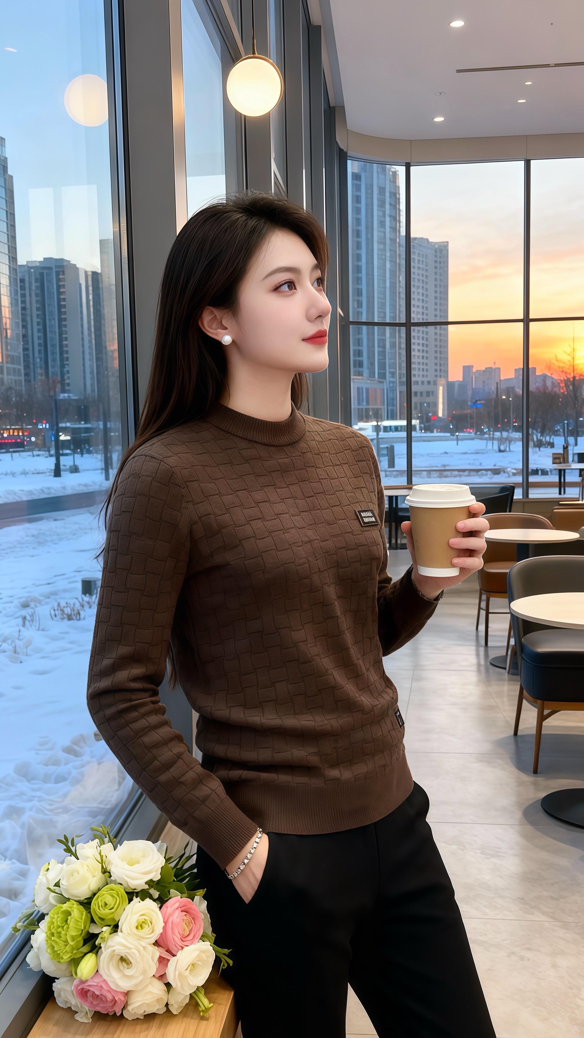 她穿咖色格纹针织衫,柔糯的面料贴合身形,衣身的方格纹路织出细腻的肌理感,胸前的小标设计添了精巧的细节,藏着慵懒的温柔。下配黑色长裤,裤型挺括却不生硬,和针织衫的软糯形成巧妙对比,整身穿搭像冬日里的焦糖饼干,甜润的咖糅合着黑的沉稳,连桌旁的花束都成了灵动的点缀。