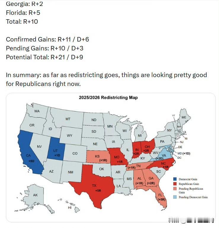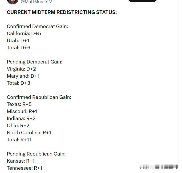 当前中期选举重新划区最新状态: 已确认民主党获得席位: 加利福尼亚州:民左党 +5 犹他州:民左党 +1 合计:民左党 +6 民左党待确认席位增益: 弗吉尼亚州:民左党 +2 马里兰州:民左党 +1 合计:民左党 +3 已确认共和党获得席位: 德克萨斯州:共和党 +5 密苏里州:共和党 +1 印第安纳州:共和党 +2 俄亥俄州:共和党 +2 北卡罗来纳州:共和党 +1 合计:共和党 +11 共和党待确认席位增益: 堪萨斯州:共和党 +1 田纳西州:共和党 +1 阿拉巴马州:共和党 +1 乔治亚州:共和党 +2 佛罗里达州:共和党 +5 合计:共和党 +10 已确认合计增益:共和党 +11 / 民左党 +6 待确认合计增益:共和党 +10 / 民左党 +3 潜在总增益:共和党 +21 / 民左党 +9 总结:就重新划区情况来看,目前共和党的形势相当不错。