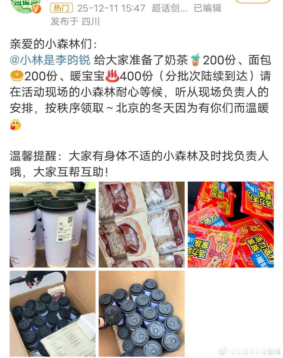 这个小零食李昀锐又给小森林逆应援啦奶茶、面包、暖宝宝,把小森林照顾得好好啊~
