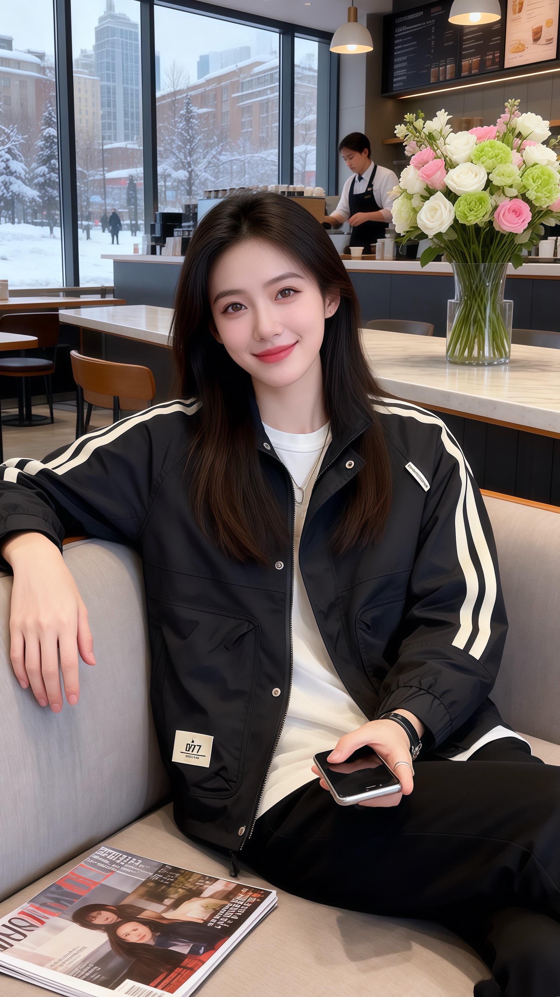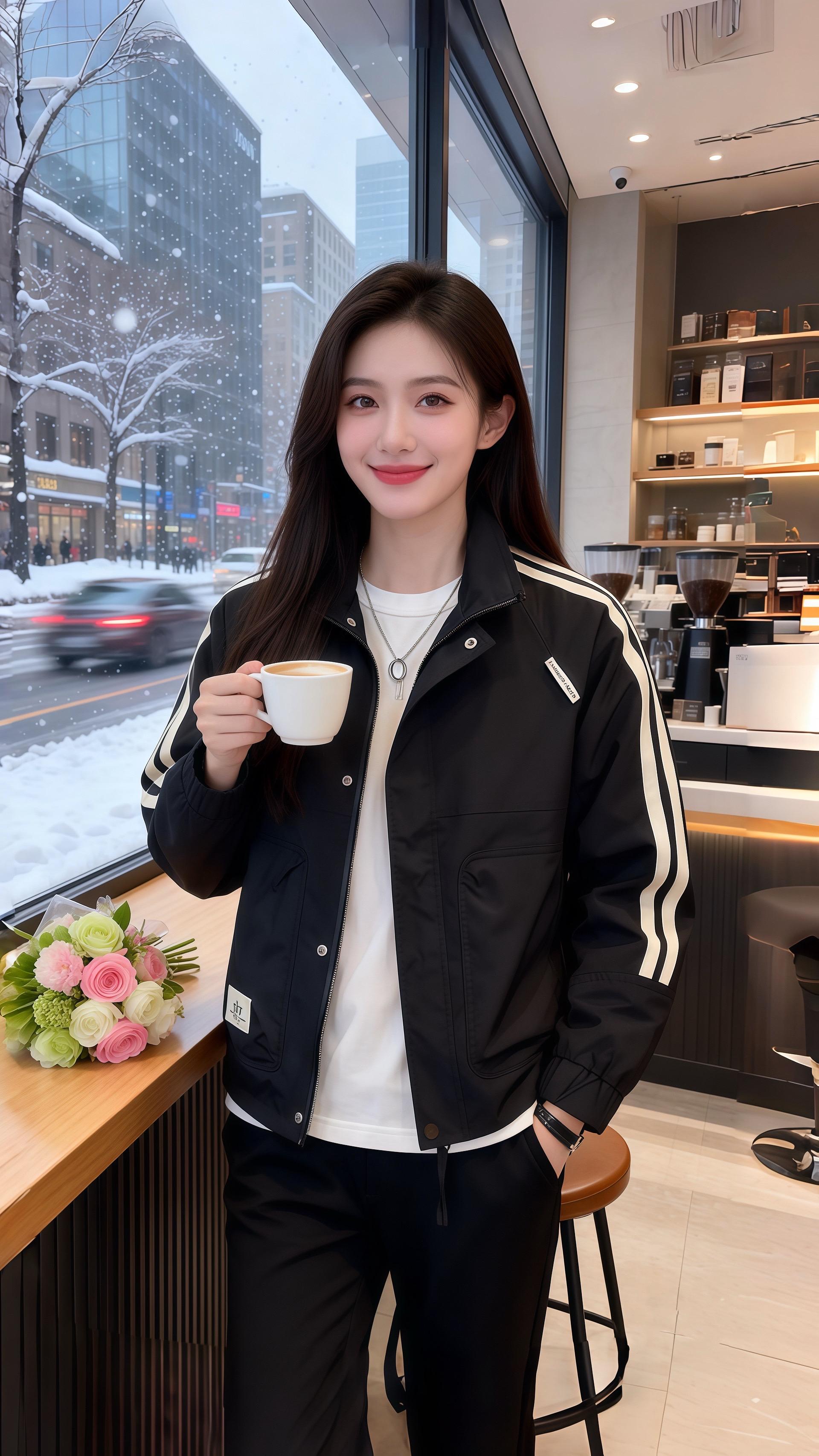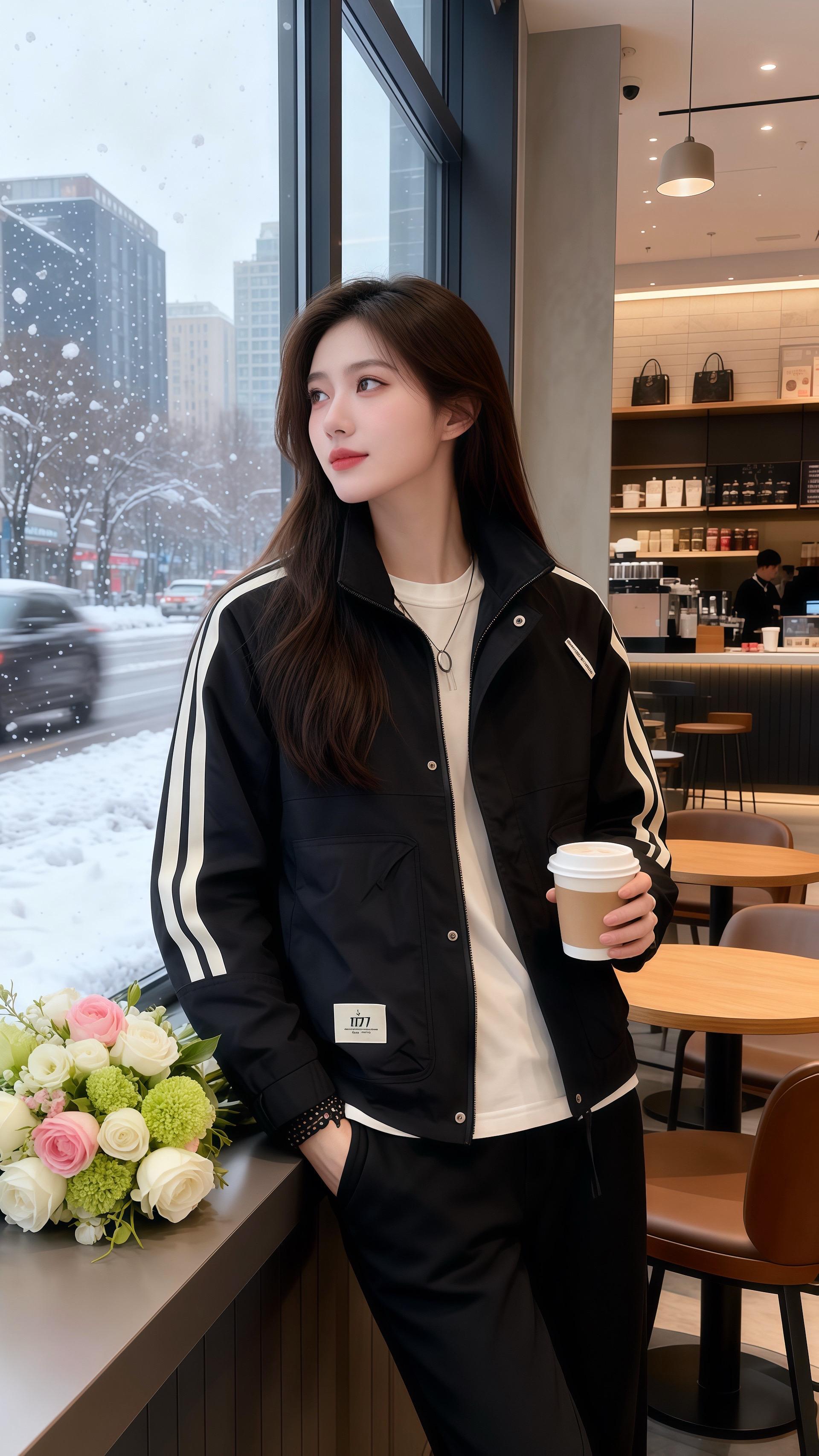她穿黑色立领短外套,面料带着顺滑的哑光质感,袖子上的白色条纹撞色亮眼,给沉稳的黑调添了几分灵动,衣身的贴袋与小标设计,让简约的版型多了细节感。内搭白色圆领打底衫,干净的白与沉黑相互映衬,衬得气质愈发清爽;下配黑色长裤,裤型宽松却不失版型,和外套的休闲风格呼应,整身穿搭像冬日里的冰美式,清冽的黑糅合着白的纯粹,连桌旁的花束都成了柔和的衬景。