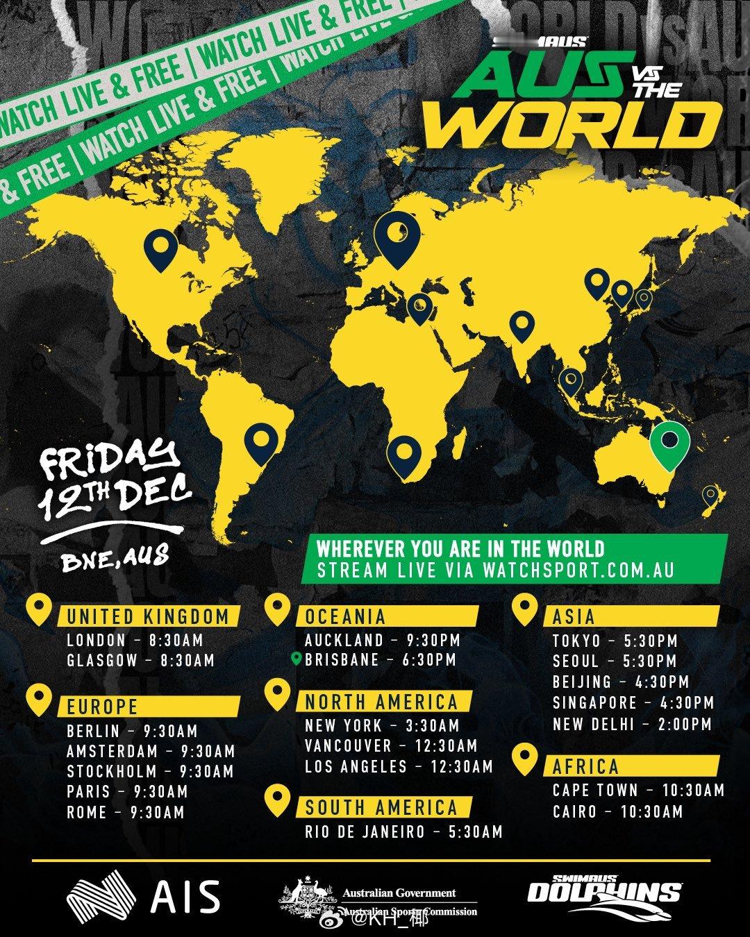 AUSvsTheWorld澳洲泳协还贴心的附上全球各地观看时间🕓