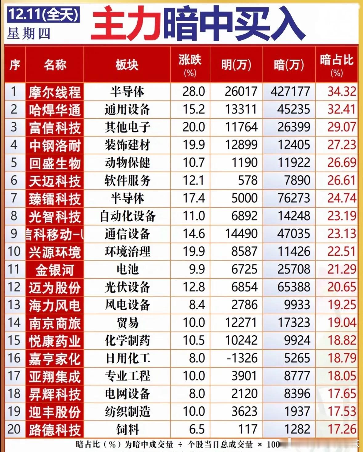 12.11主力暗中买入榜,揭秘暗盘大户!半导体领涨,风电光伏活跃,主力暗购电子、建材股,医药化工跟