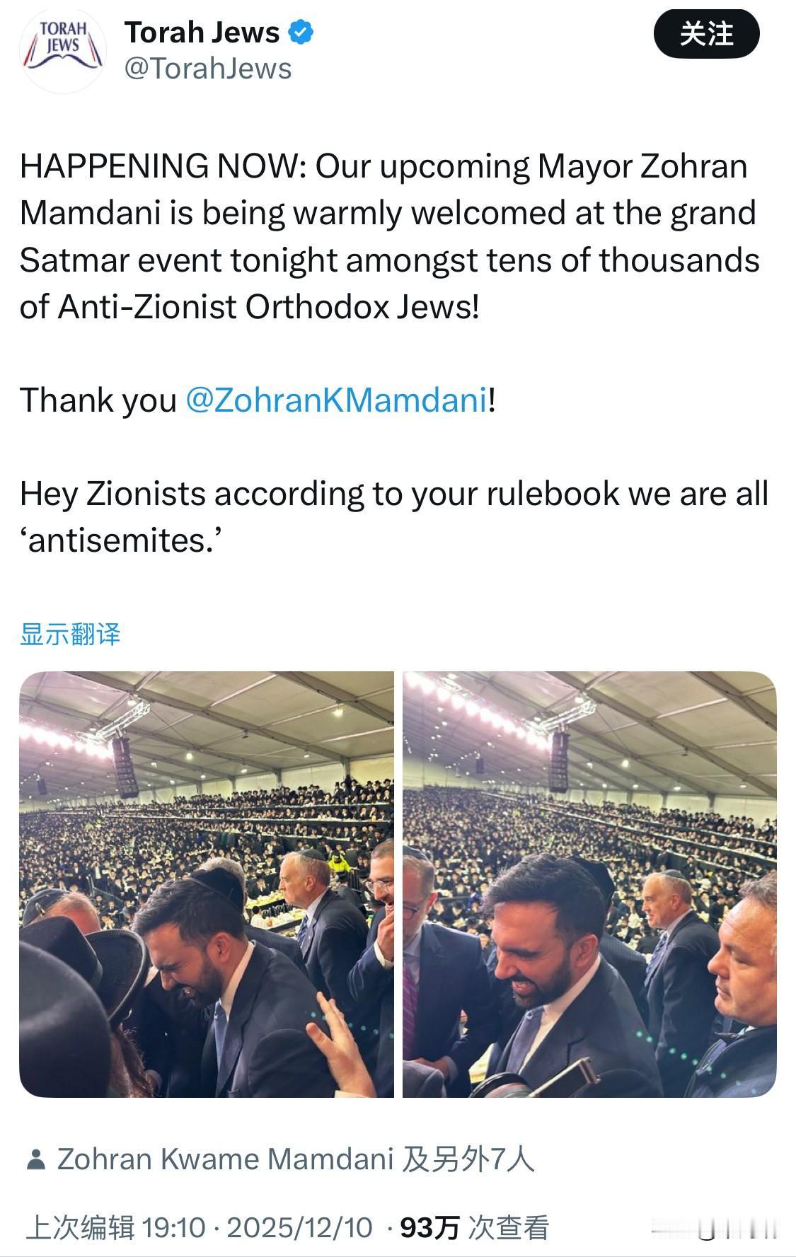 最新消息:纽约市即将上任的市长佐兰·马姆达尼今晚在盛大的萨特玛活动中受到数万名反犹太复国主义正统犹太教徒的热烈欢迎! 成千上万的纽约犹太人都明白,反对犹太复国主义并不等同于“仇恨犹太人!” 纽约市萨特玛(Satmar Hasidic)社区的活动主要围绕其位于布鲁克林威廉斯堡 (Williamsburg) 和纽约上州 基尔亚斯乔尔 (Kiryas Joel) 的主要社区中心展开。这些活动通常具有强烈的宗教和社区属性,并且很少公开发布在主流活动网站上,而是通过社区内部渠道传播。