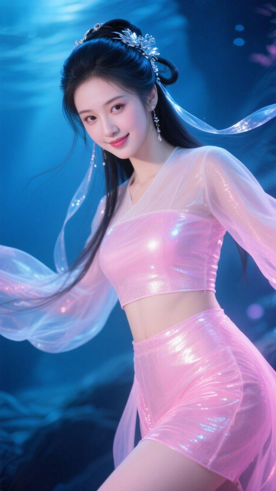 鲛波间的粉袂仙 幽蓝水纹漫过衣裾时,她抬眸含笑。 薄纱袖摆随暗流漾作烟霭,粉裳裹着细碎星芒,恰似揉碎的月华落进深海玉匣。发间银饰沾了水色,垂坠的耳珰轻贴颈侧,柔发缠过腕间——这哪里是俗常衣装,分明是春绯染了云缕,裁就一身清灵。 她侧首时,眼尾柔色漫开,比深海渐亮的荧光更温软。裙角拂过处,该是游开了几尾透纱似的鱼吧?不然怎会连周遭的潮意都浸了清甜。 原来踏波而来的,从不是幻梦。是春澜里生就的仙,借鲛波作衬,在蓝得轻颤的深海间,替人间挽住了半缕粉绒似的风。 古风仙韵 深海清姿