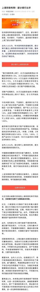 等等,我没看错吧?存款利率,居然涨了? 满世界都在喊降息,连余额宝都快没眼看了,居然有银行年底了反向操作。 这事儿确实挺有意思。但仔细一想,银行这波操作,其实是在和时间赛跑。 年底了,银行的存款指标压力山大。就跟咱们要完成年终任务一样。他们需要把报表做得漂亮点。提高短期利率,是最直接的办法。这就像商场年底大促,目的就是吸引人气,快速回笼资金。 看看新闻就知道,大方向还是降息。央行一直在引导贷款利率下行,来支持实体经济。存款利率整体走低是大趋势。个别银行的短期上调,改变不了这个大局。 所以别被这“逆势”上涨给迷惑了。这更像是一种战术,而不是战略转变。银行精得很,算盘打得比谁都明白。 对普通人来说,关键要看清楚两点。一是期限,这种高利率多半是短期的。有的可能只针对三个月、半年期的定存。二是门槛,可能对新资金有要求,或者有金额限制。 如果手头正好有一笔短期不用的闲钱,去薅一把羊毛也无可厚非。赚点零花钱总是好的。但要是把长期养老钱、买房首付都挪过去,就得不偿失了。流动性被锁死,万一急用钱就麻烦了。 更重要的是,不能把这当成理财的风向标。指望存款利息能跑赢通胀,那是不现实的。理财还是要多元化,不能光盯着存款。 说到底,银行和储户之间,永远存在一种微妙的博弈。银行需要储户的资金来完成指标,储户希望资金安全又能增值。但这种年底临时抱佛脚的高息,解决不了根本问题。 真正的理财智慧,在于看清大势,保持冷静。不要因为一点短期小利就打乱自己的长期计划。财富的增长,靠的是稳健的策略和耐心,而不是追逐每一个看似诱人的小浪花。 这波操作过后,市场还是会回归常态。该降的,终究会降。 MCN双量进阶计划