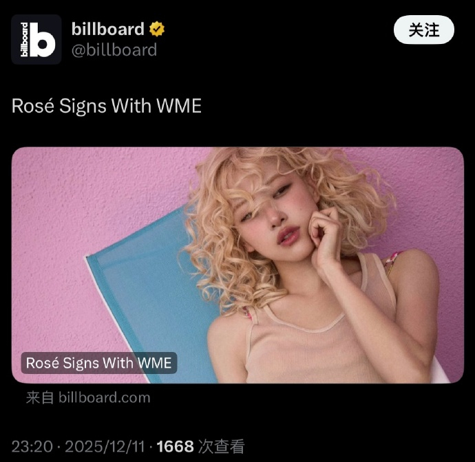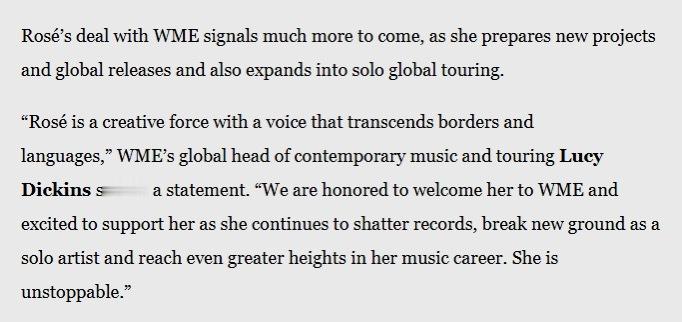 朴彩英签约新公司朴彩英将开启个人全球巡演 朴彩英签约美国WME(William Morris Endeavor)经纪公司:Rosé与WME的签约,预示着更多精彩即将展开— 她正在筹备全新的个人项目与全球发行计划,同时也将开启个人全球巡演。