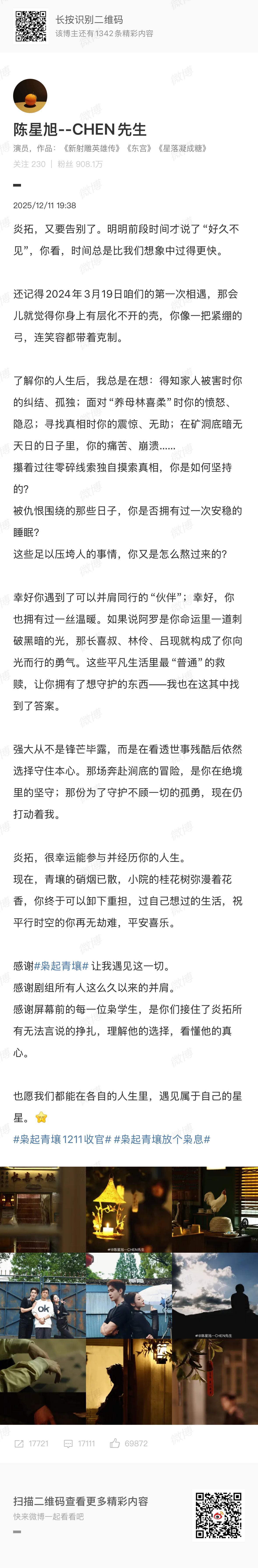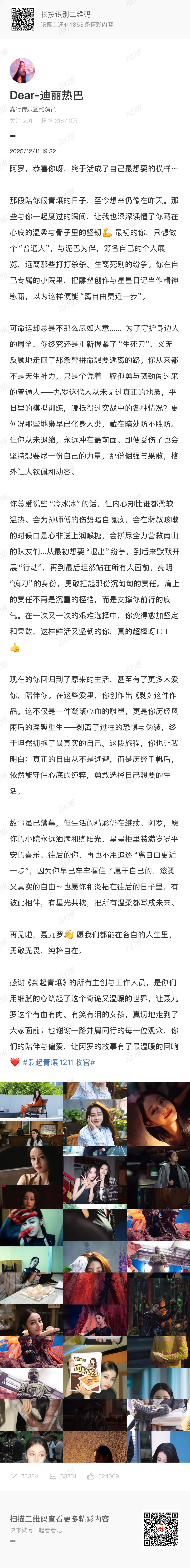 迪丽热巴发长文告别聂九罗陈星旭发文告别炎拓 都发长文告别了:“再见啦,聂九罗👋 愿我们都能在各自的人生里,勇敢无畏,纯粹自在。” “也愿我们都能在各自的人生里,遇见属于自己的星星。”