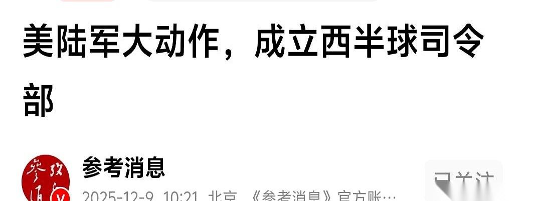 炸了。 美军真搞了个“西半球司令部”。 这名字,一听就感觉不是善茬,跟电影里那种最终反派的组织名似的。 之前他们说要把重心挪回拉美,很多人都当个笑话听,觉得是满世界跑累了,力不从心,准备回家歇着了。 结果呢? 人家不是收缩,是回家磨刀去了。 直接把原来管北美和南美的陆军,全捏巴捏巴,塞进这一个“超级司令部”里。 这架势是要干嘛? 说白了,就是要把自己家“后院”这摊子事儿,彻底捋顺了。以后谁是老大,谁说了算,规矩得重新立一遍。 而且这事儿往深了想,还有一层意思。 这么一整合,权力不就更集中了吗?以后总统想调兵遣将,是不是更方便、更没杂音了? 所以啊,永远别听他说了什么,要看他做了什么。 世界这个牌桌上,大佬们从来不说什么废话。 人家只是换了个更舒服的姿势,准备摸下一张牌罢了。