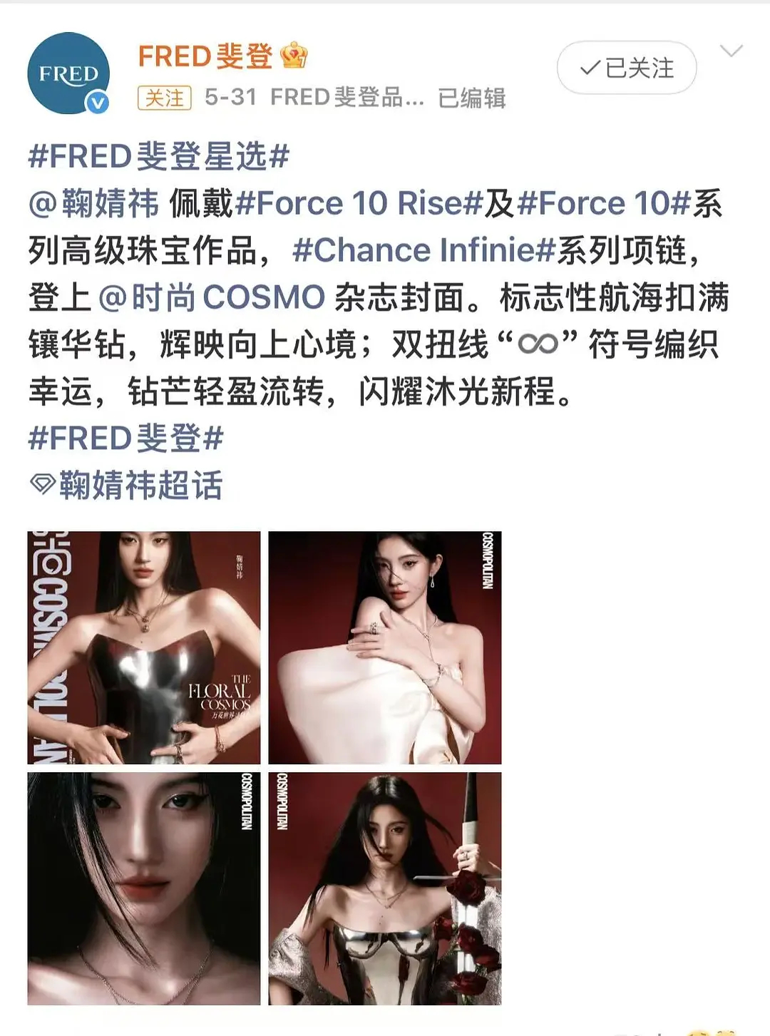 Fred给鞠婧祎推的第二本五大,第一本是cosmo,好宠爱的品牌方妈咪