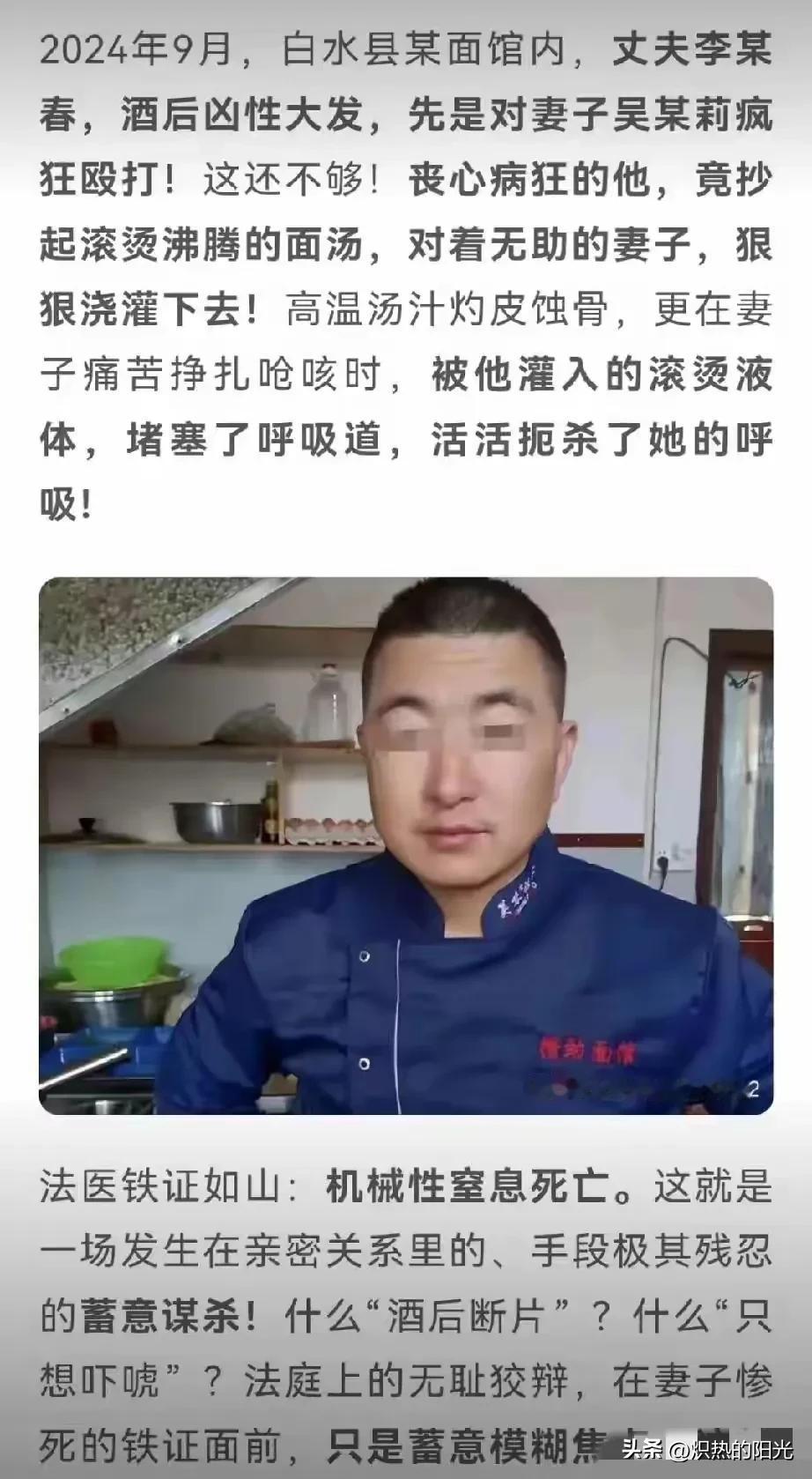 这哪是家暴,这是丧心病狂的谋杀! 世上最毒的不是蛇蝎,而是枕边人的心 陕西男子殴打妻子5小时,用70℃面汤灌喉,最后按入锅中活活呛死!看到这短短一句话你是不是和我一样浑身的汗毛都竖起来了? 一个男人,对着自己的妻子下死手,整整五个小时的折磨,光是听着都让人脊背发凉。 事后他说自己喝多了,就是想吓唬吓唬对方——这话骗谁呢?谁吓唬人会用70度的滚烫面汤往人喉咙里灌?谁吓唬人会把活生生的人按进面汤锅里?这哪是什么夫妻矛盾,分明是把枕边人当成了不共戴天的仇人! 想想那个可怜的女人,拳头一下下砸在身上,滚烫的面汤灼烧着喉咙,她得多疼、多绝望啊?本该是暖胃的家常面汤,愣是被这个恶魔变成了索命的凶器。事后一句“喝醉了”就想轻飘飘揭过?天底下哪有这么便宜的事! 幸好岳父母硬气,打死也不签谅解书,这可是他们的亲闺女啊,平白遭了这么大的罪,凭什么原谅?还有那两个成年的孩子,她们是妈妈身上掉下来的肉,真希望她们能挺直腰杆,为妈妈讨一个公道。 两天后案子就要开庭了,所有人都在等着一个公正的判决。这起案子也狠狠撕开了家暴的遮羞布——有些婚姻根本不是避风港,而是吃人的炼狱!面对这种披着人皮的恶魔,就该让法律重重地罚,才能告慰逝者的冤魂! 家暴只有零次和无数次,而当家暴升级为这般残忍的伤害时,绝不能用“酒后失控”“家庭纠纷”来轻描淡写。必须依法严惩,让施暴者付出最沉重的代价,才能震慑住更多潜藏的恶魔,也才能给所有身处恐惧中的受害者,一点挣脱的勇气。 网友说:狂虐5个小时,这五个小时的每一分钟,都像在人间地狱中!这个男的枪毙都太轻了,应凌迟处死,而且必须凌迟5个小时才能让他死,大家是否认同? 希望国家用恢复明清年代的刑法,用凌迟处死,稍轻的罪犯凌割150刀,像这种罪大恶极的最多的割3580刀才让罪犯死,以解心头之恨! 家暴 家暴致死 家暴违法行为 家暴定罪