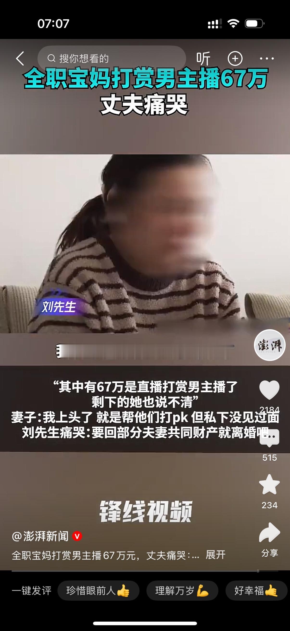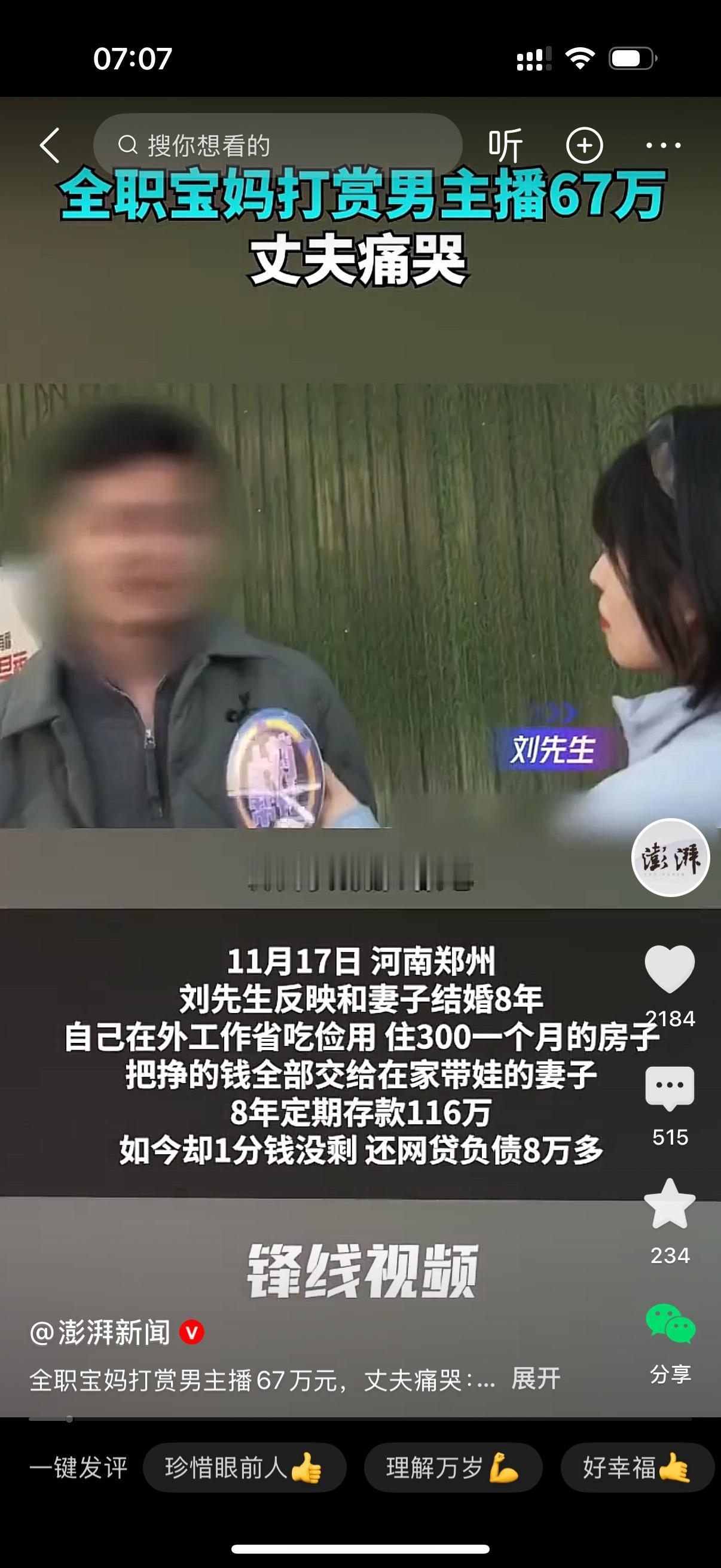 河南郑州的刘先生欲哭无泪,想死的心都有了。刘先生说,和妻子结婚8年,自己在外面省吃俭用,住300元一个月的房子。他把挣的钱全部交给在家带娃的妻子,8年定期存款116万,现在一分不剩,还网贷负债8万多。原来妻子直播打赏给男主播就有67万,剩下的钱哪去了,她也说不清楚。刘先生痛哭,要回部分夫妻共同财产就离婚。