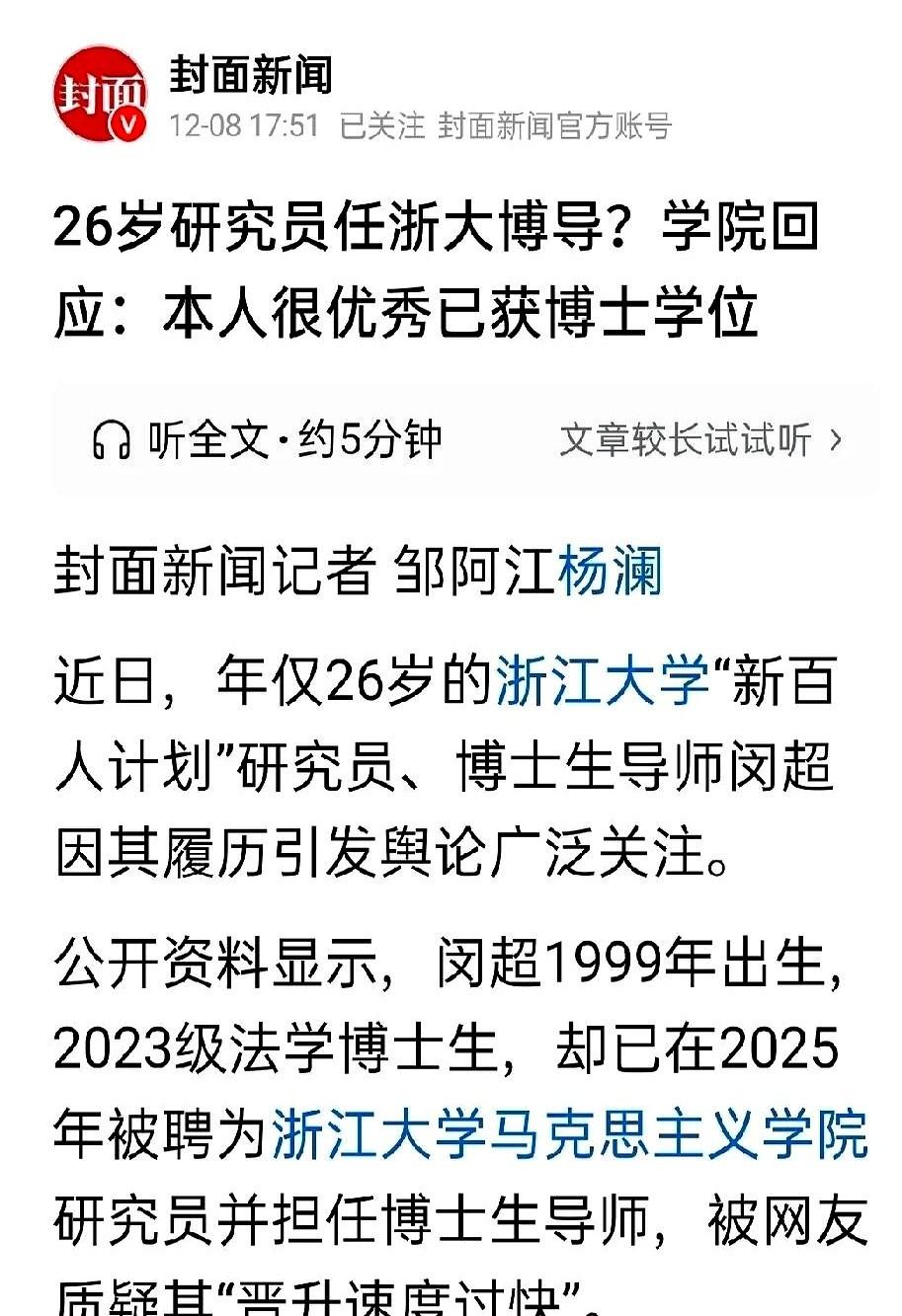 26岁,博导。 浙大的。 我都能想象到一堆人下巴掉地上的样子。 然后就是各种酸话,说什么“凭什么”、“有背景吧”。 嗨,我说,都什么年代了,还搁那儿论资排辈呢? 人家那份闪闪发光的履历,你拿放大镜看都找不出毛病。我们还在纠结他年龄的时候,人家早就在我们看不到的地方,付出了我们想象不到的努力。 这事儿真正扎心的地方,根本不是他26岁当了博导。 扎心的是,人家26年的人生密度,活得比我们大多数人一辈子都精彩、都硬核。 所以啊,我觉得这反而是天大的好事。 说明什么? 说明我们真的开始敢用人了,不看年龄,只看本事。 这种不拘一格降人才的魄力,才是一个顶尖学府真正该有的样子。 都散了吧,别酸了。 给牛人让路,也给自己提个醒儿,世界早就不是我们以为的那个规矩了。