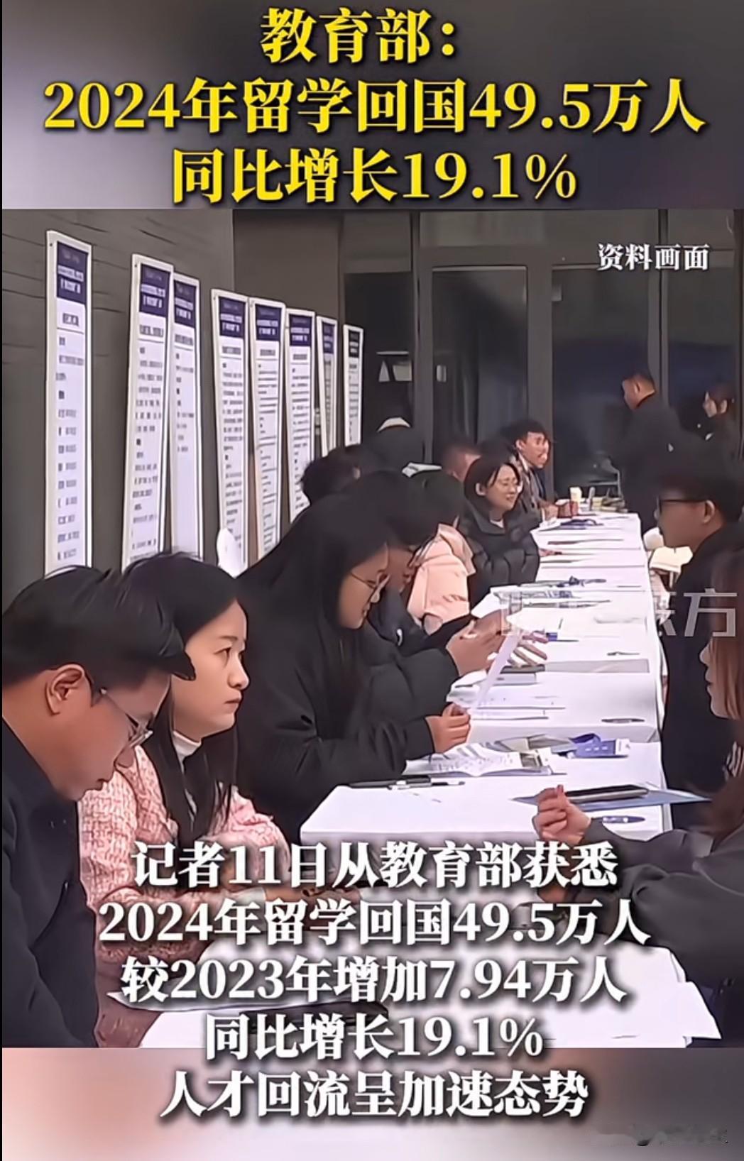 教育部最新数据显示,2024年我国留学回国人数达到49.5万人,同比增长19.1%,创历史新高。这一数据反映出我国对海外人才吸引力的增强,同时也体现了国内发展环境的持续优化。 "归国潮"背后,是我国经济结构转型升级对高端人才的迫切需求,以及各地政府出台的一系列人才引进优惠政策。然而,如何让这些归国人才更好地发挥作用,实现人尽其才,仍是需要持续关注的问题。留学人员应结合自身优势,找准发展定位,在国内广阔的发展舞台上实现价值。