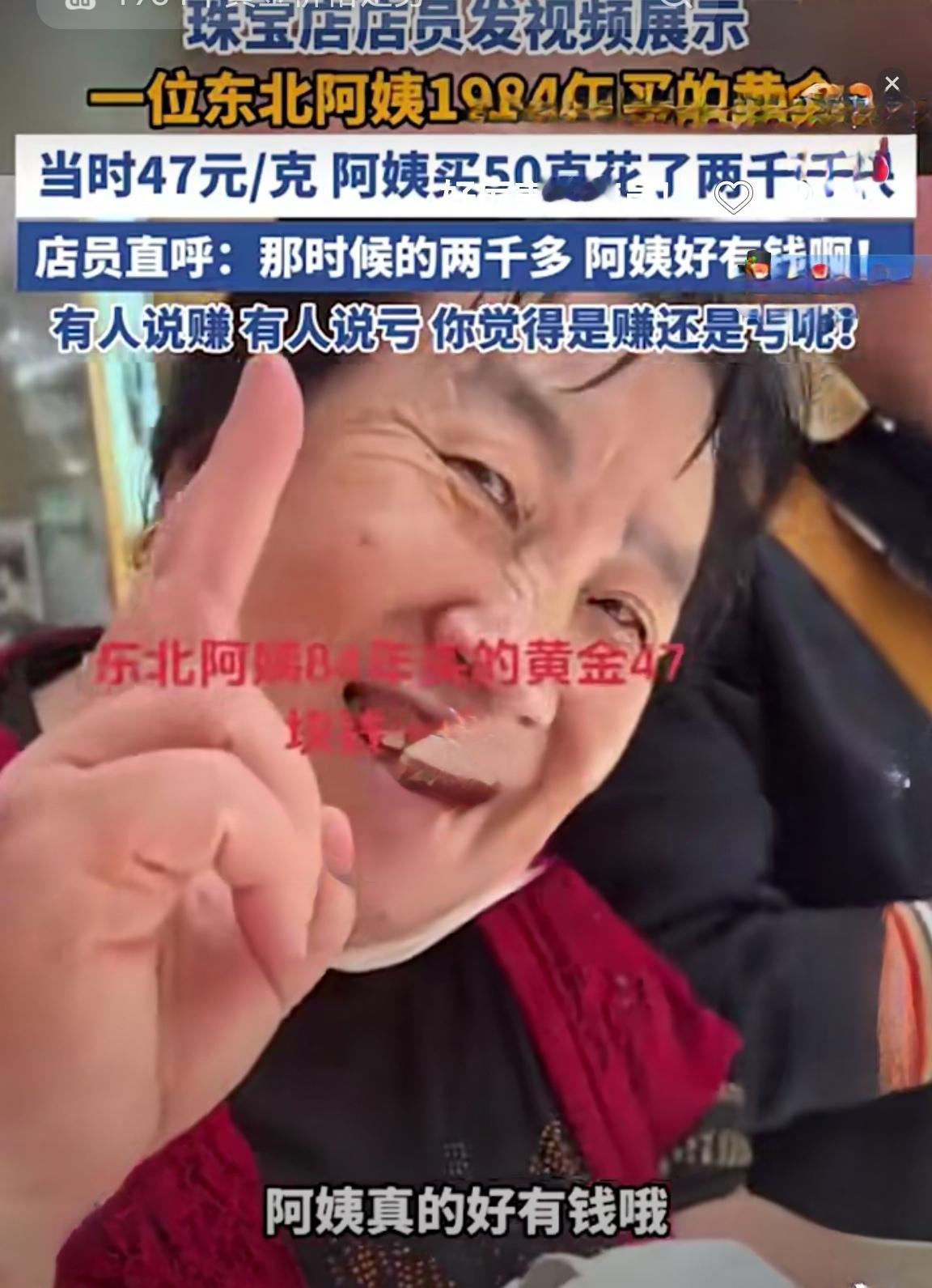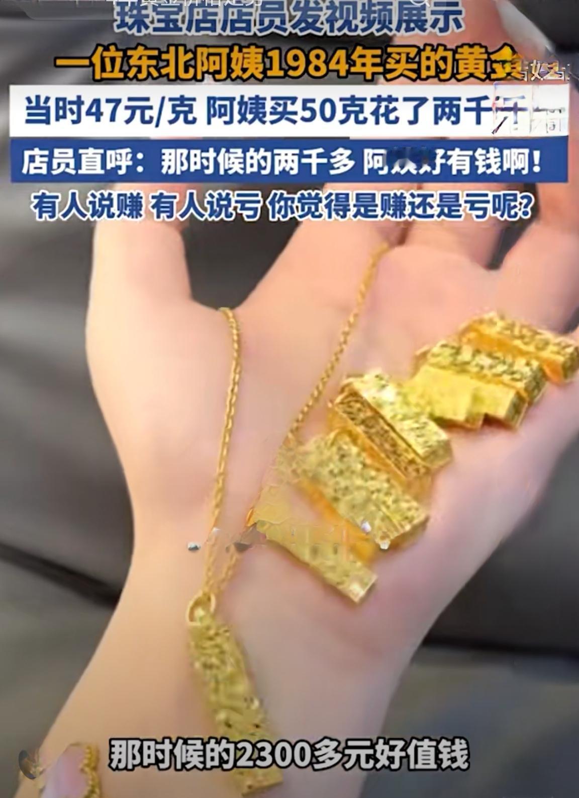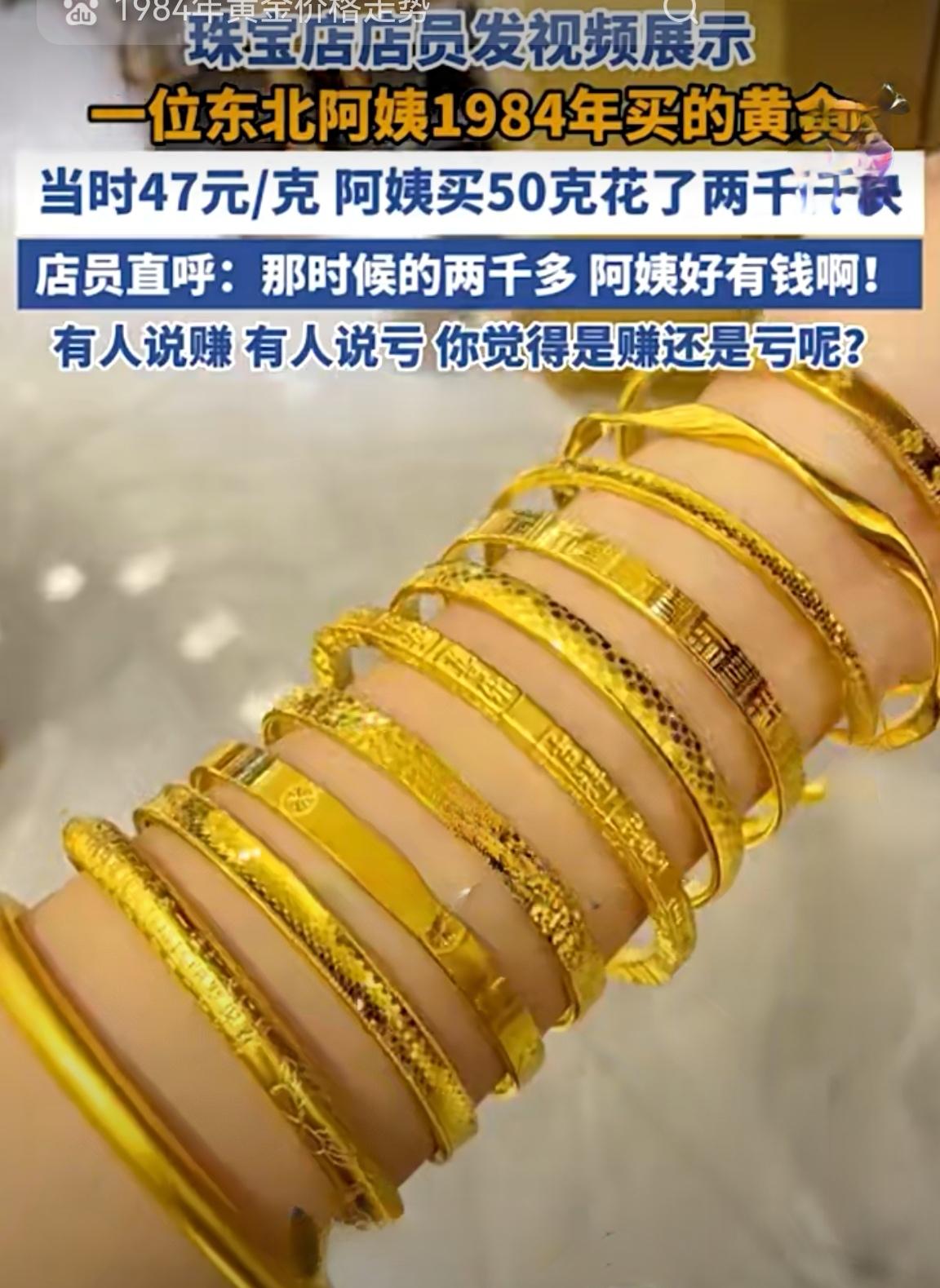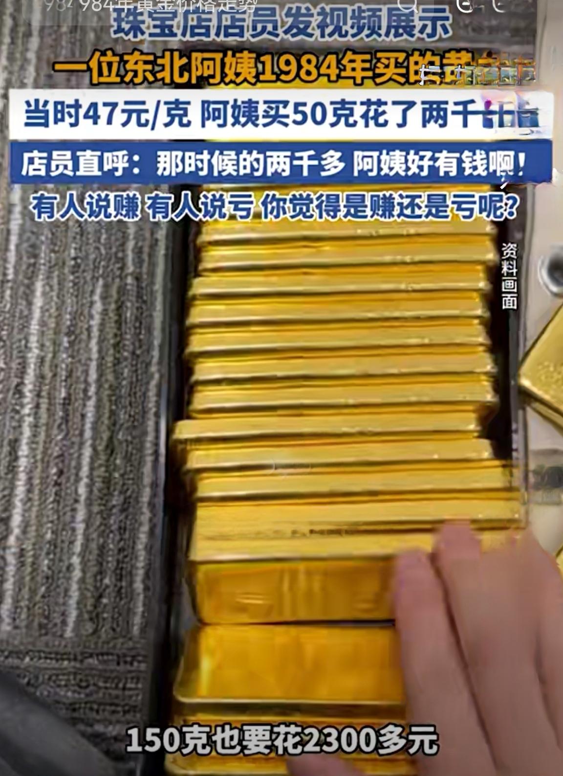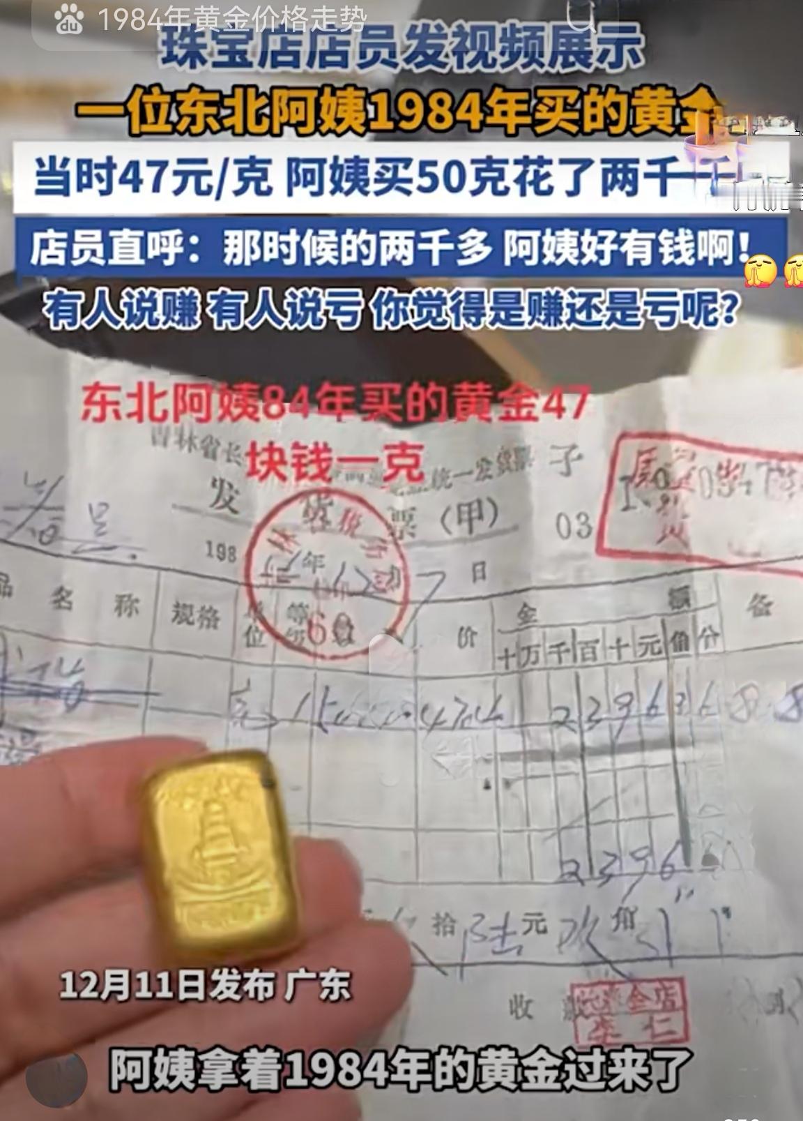 东北阿姨赚翻了! 1984年买的黄金47元/克 近日,广东某珠宝店店员展示了一东北阿姨1984年购买的黄金,引发广泛关注。当时黄金价格为47元/克,阿姨以2350元购入50余克,这一金额在人均月工资仅40-80元的1984年,相当于普通职工2至5年的积蓄总和。按2025年12月回收价960元/克计算,这批黄金市值已飙升至4.8万元,较原始投入暴涨20倍;即使按投资金条价550元/克计算,仍有2.75万元,涨幅近12倍。 对比同期理财路径:若将2350元存入银行,按年均6%利率复利计算,41年后本息合计约2.8万元,与黄金收益相当,但需承受利率波动风险;若购置房产,当时小县城房价约50元/平方米,2350元可购47平方米住房,按2025年均价5000元/平方米计算,市值达23.5万元,远超黄金收益,但需承担折旧、政策变动等风险。阿姨的选择印证了黄金作为“硬通货”的抗通胀属性,其价格涨幅既反映了全球经济波动下的避险需求,也凸显了长期持有实物资产的保值价值。