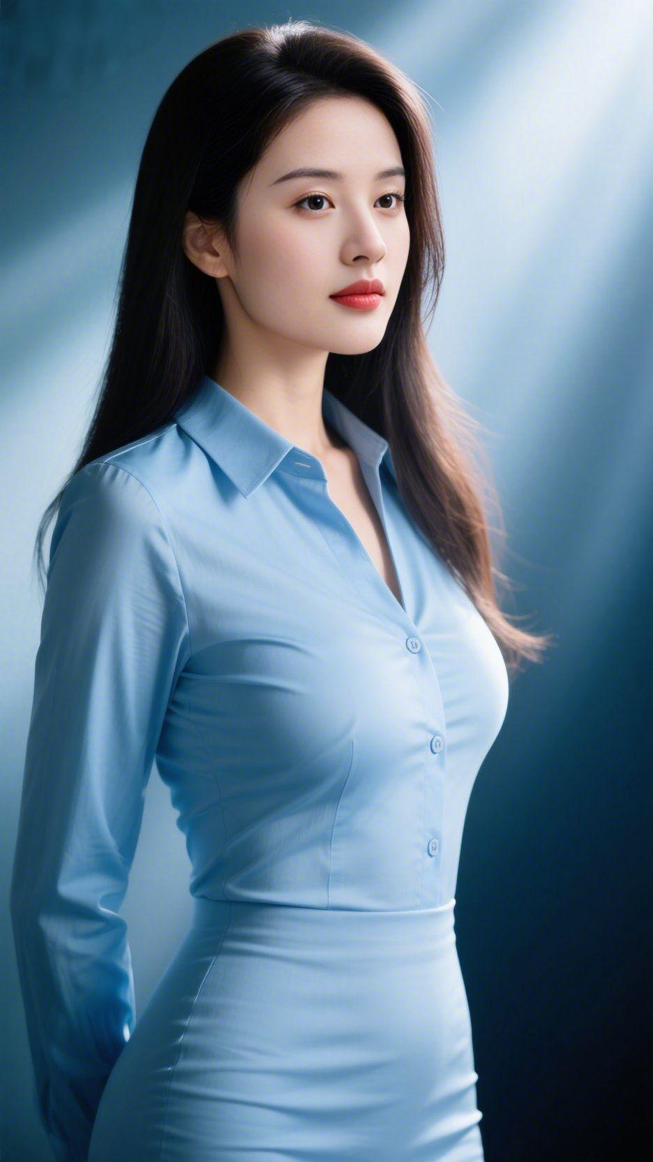 浅蓝里的柔光 雾蓝底色裹着一束轻光漫开时,她静立在那里,像把晴日的淡空裁作了衣装。 发梢浸着清透的蓝调,唇间一点红是冷感里揉进的温软。没有刻意的姿态,只是从容站着,肩线随衣料的垂感轻落,垂在身后的指尖也裹着舒展的松弛。 光影是轻的,像风擦过湖面的弧度,落向衣摆,又漫入眼底的静。这不是刻意勾勒的画面,是恰好的松弛里,自然妥帖的模样。 原来舒展从不是张扬的模样,是安静之中,自带着的温和力量。 冷调质感穿搭 氛围感人像