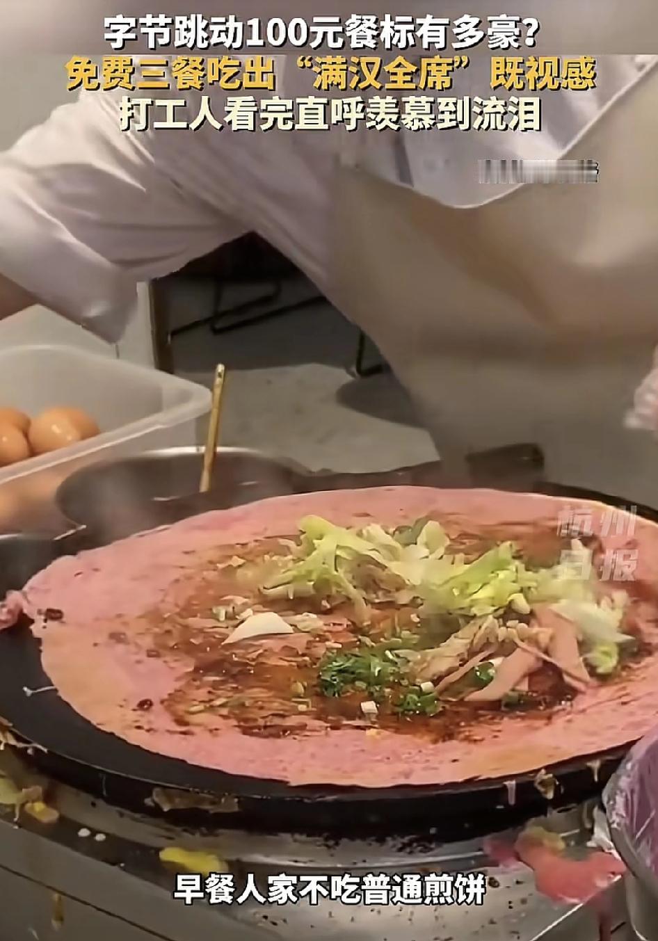 有来自字节跳动公司的员工分享了公司里100元的免费一日三餐餐标,真的是羡煞旁人,早餐的意大利面煎饼,鸡蛋,火腿,生菜随便加,午饭炒铁板葱油鸡,水煮鱼,下午茶一点都不含糊,晚餐还可以免费打包多种的卤味。当然能够加入这样的公司,高等学历是少不了的。
