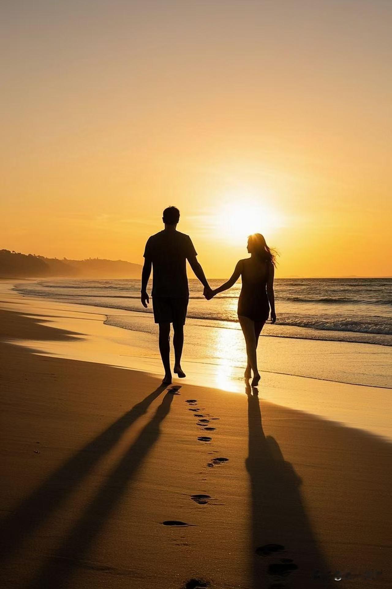 夕阳下的浪漫漫步,手牵手看海浪轻拍沙滩。