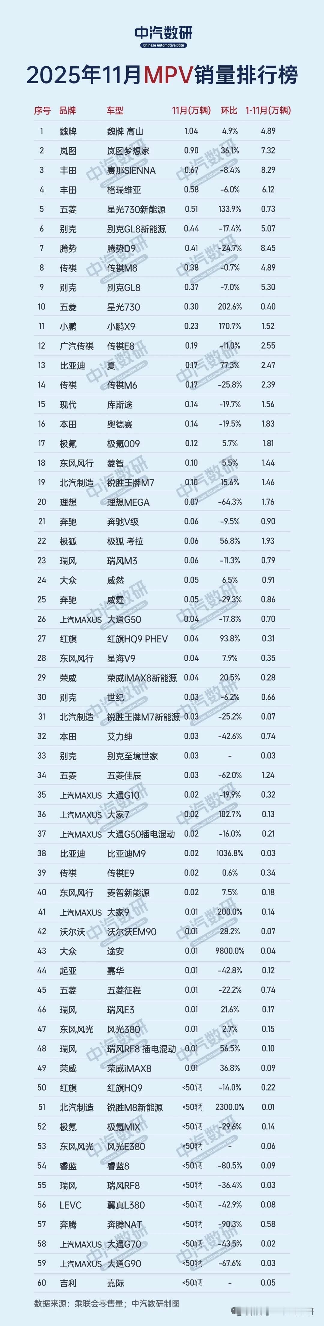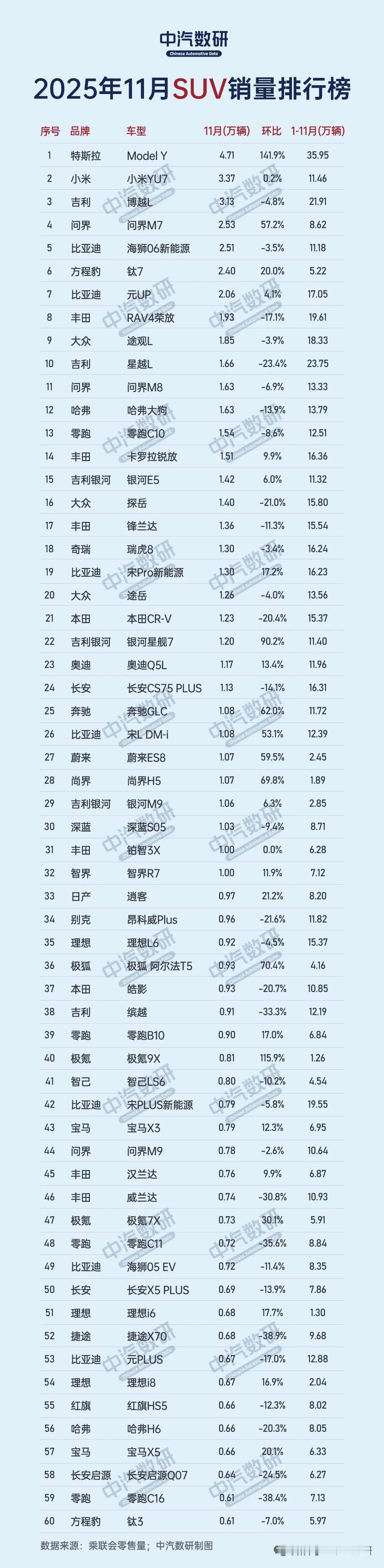 看到了中汽数研的销量。 2025年11月轿车销量TOP3分别为:五菱宏光MINIEV,5.68万辆,1-11月累计销量40.62万辆;吉利星愿,4.20万辆,1-11月累计销量42.96万辆;日产轩逸,3.84万辆,1-11月累计销量29.60万辆。 2025年11月SUV销量TOP3分别为:Model Y,4.71万辆,1-11月累计销量35.95万辆;小米YU7,3.37万辆,1-11月累计销量11.46万辆;博越L,3.13万辆,1-11月累计销量21.91万辆。 2025年11月MPV销量TOP3分别为:魏牌高山,1.04万辆,1-11月累计销量4.89万辆;岚图梦想家,0.90万辆,1-11月累计销量7.32万辆;丰田赛那,0.67万辆,1-11月累计销量8.29万辆。【来自懂车帝车友圈】
