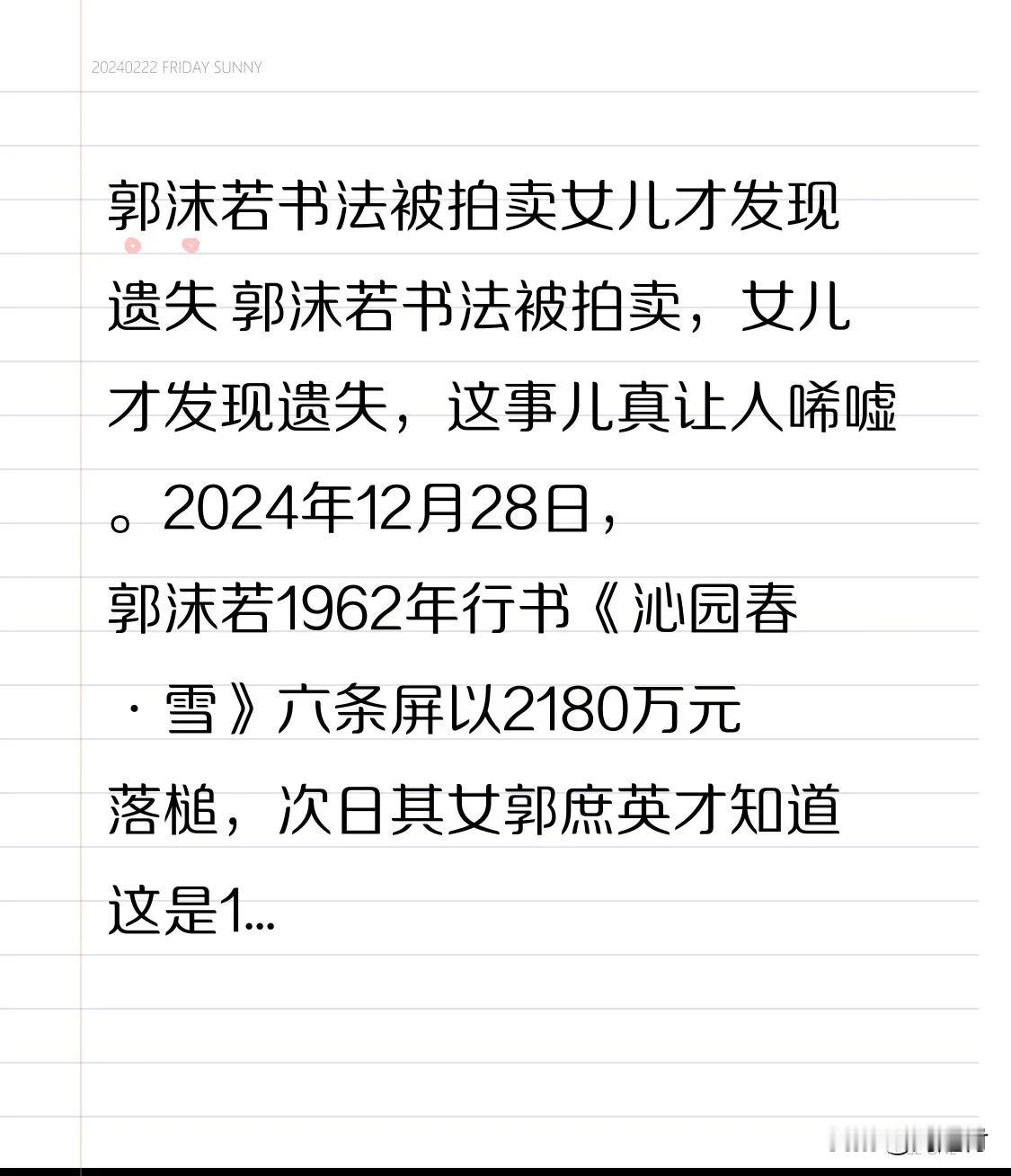 郭沫若书法被拍卖女儿才发现遗失 郭沫若书法被拍卖,女儿才发现遗失,此事令人唏嘘。2024年12月28日,郭沫若1962年行书《沁园春·雪》六条屏以2180万元落槌,次日其女郭庶英才得知,这是1983年家中失窃未找回的“遗失物”。 还有他1961年所写的《蜀道奇》,末尾题着“书付庶英”,本是留给女儿的。12月16日,该书法要上保利秋拍,郭庶英才发现丢失,赶忙维权。 这些在收藏界堪称硬货的书法,历经波折。这不仅触动家族情感,物权归属和文物监管问题也值得深思。 郭沫若 郭沫若历史剧 郭沫若照片