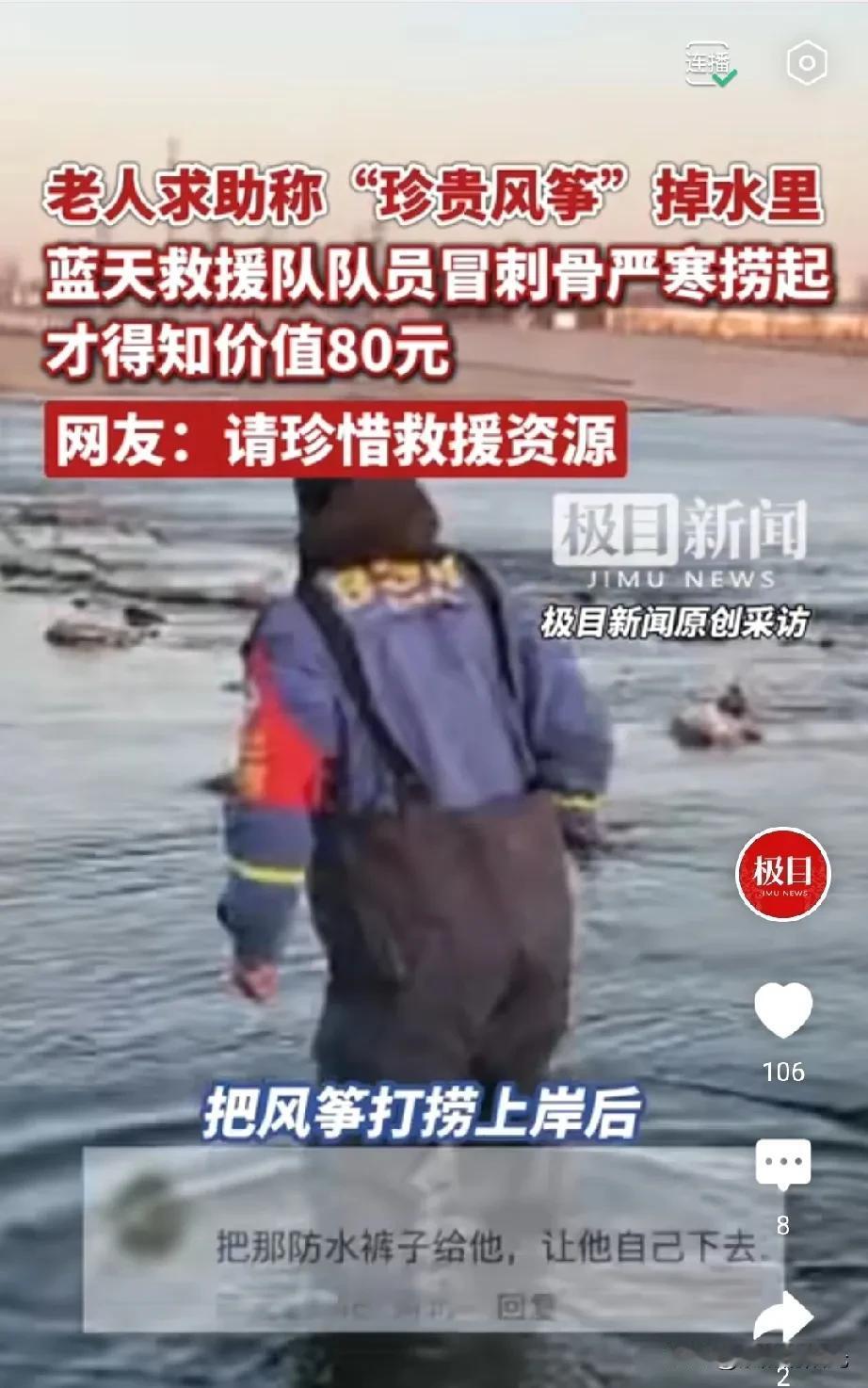 房山一老人,前几天把风筝放掉河里了,给救援队打电话喊“这风筝特珍贵”,求着捞。 零下五六度的天,队员穿防水裤踩冰河里,冻得骨头疼才把风筝捞上来,一问价格才80块!当时队员都懵了,队长后来说“早知道是这价,真不会派人来”。 但我觉得吧,老人嘴里的“珍贵”可能不是钱——说不定是孩子送的,在他心里这就是宝贝。可救援队是救命的资源啊,万一捞风筝的时候有真的紧急救援,这不耽误事吗? 换个角度想,老人可能没这意识,我们普通人真得拎清救援不是“帮捞东西”的,别让队员的寒冰里付出,浪费在不值当的小事上。当然也希望老人能明白,下次别这么“小题大做”了。 网友:如果有下次,把防水裤给他,叫他自己去捞!房山蓝天救援队 风筝坠落 救风筝