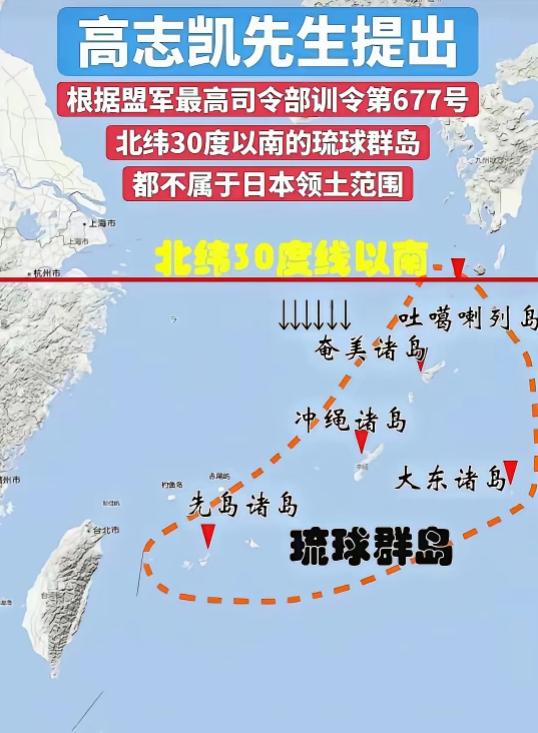 高志凯教授把盟军最高司令部训令677号都扒出来了,并明确指出:北纬30度以南的琉球群岛,根本不属于日本领土的范围。   高志凯教授这波操作真是把历史实锤直接砸到了台面,硬生生扒出盟军最高司令部训令677号,就是要告诉全世界:北纬30度以南的琉球群岛,压根就不是日本的领土,这可不是随口说说,是有实打实的历史文件和国际法依据撑着的,谁想赖都赖不掉。   要搞明白这事儿,得先回到二战刚结束那会儿,当时日本战败投降,同盟国可没打算让它再像以前那样占着别人的地盘横行霸道,所以先有了《开罗宣言》,后有了《波茨坦公告》,这俩文件说白了就是给日本划红线,明确说了日本必须把侵略来的领土都吐出来,领土范围只能是它自己的核心区域。   但光有原则性规定还不够,得有具体文件落地执行啊,于是在1946年1月29日,盟军最高司令部就发布了训令677号,也就是咱们说的SCAPIN-677,这文件就是专门落实前两个公告的领土规定,给日本的施政权范围钉死了框框,让它再也没法含糊其辞。   这训令里写得明明白白,一点都不绕弯子,日本能行使施政权的地方,就只有本州、北海道、九州、四国这四个主岛,除此之外,其他一大堆地方都明确排除在外,根本不归日本管。   这里面就重点提到了北纬30度以南的琉球群岛,还有伊豆群岛、小笠原群岛这些太平洋岛屿,另外郁陵岛、竹岛(独岛)、济州岛,以及千岛群岛、齿舞群岛、色丹岛这些区域,也都被划在了日本管辖权之外。   意思很简单,这些地方要么是日本以前靠侵略抢来的,要么是本来就不属于它的,现在二战结束了,必须把这些地盘的管辖权交出来,日本没资格再对这些地方指手画脚。   可能有人会问,这训令到底有没有法律效力?那必须有啊!   它是同盟国在二战后规范日本领土边界的关键文件,是落实《开罗宣言》和《波茨坦公告》的具体行动,而这两个公告本身就是国际社会公认的、具有法律效力的文件,日本当年签投降书的时候,也明确承认了这些文件的约束力,相当于自己画了押认了账,现在想不认都不行。   而且677号训令是盟军最高司令部发布的,当时日本处于被占领状态,完全得听同盟国的安排,这训令就是当时规范日本领土的“硬规矩”,不是谁想改就能改的。   再说说琉球群岛本身,它本来就有自己的历史和文化,以前是独立的琉球王国,后来是被日本强行吞并的,本来就不是日本原生领土。   二战后同盟国之所以在677号训令里特意把它排除在日本管辖权之外,就是要纠正日本的侵略行为,剥夺它对这些侵略所得领土的控制权。   后来美国虽然在1972年搞了个所谓的“冲绳返还”,把琉球的施政权交给了日本,但这完全是美国单方面的操作,根本没有经过同盟国的一致同意,也违背了《开罗宣言》《波茨坦公告》和677号训令的核心精神,在国际法上根本站不住脚。   要知道,施政权和领土所有权根本不是一回事,就算美国把管理权暂时交给日本,也不代表琉球就成了日本的领土,这是两个完全不同的概念,日本可别揣着明白装糊涂。   高志凯教授把677号训令扒出来,就是要戳破日本长期以来的含糊其辞,让大家看清历史真相。   日本这些年一直想把琉球当成自己的领土,甚至在上面搞军事部署,不断强化存在感,但不管它怎么折腾,都改变不了历史事实。   677号训令白纸黑字写得清清楚楚,《开罗宣言》和《波茨坦公告》的原则也不容违背,这些都是战后国际秩序的重要组成部分,不是日本想否定就能否定的。   其实说到底,琉球群岛的归属问题,本质上是历史正义和国际法准则的问题。   日本作为二战的战败国,本来就该遵守战后形成的一系列国际文件,老老实实接受领土边界的划定,而不是总想打擦边球,试图模糊历史真相。   高志凯教授的解读,就是基于这些铁打的历史事实,告诉全世界:北纬30度以南的琉球群岛不属于日本,这是有充分历史依据和国际法支撑的,任何想歪曲历史、侵犯琉球群岛权益的行为,都是站不住脚的,也必然会遭到国际社会的反对。   现在越来越多的人开始关注琉球问题的历史真相,677号训令这个关键文件的曝光,更是让日本的主张失去了立足之地。   不管日本今后怎么辩解,怎么试图强化对琉球的控制,都改变不了它对琉球群岛没有领土主权的核心事实,历史的账本早就记得明明白白,谁也别想赖掉。