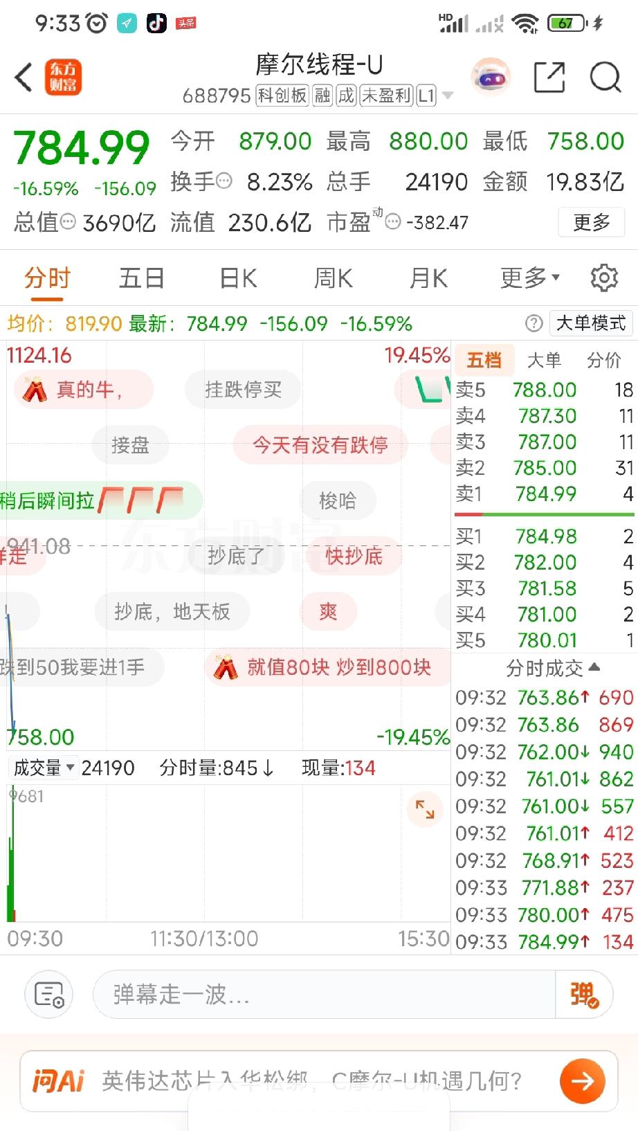 乖乖,太震惊了!摩尔线程今天一开盘就大幅走低,差点跌了20个点。今天跌得应该不少,真不知道昨天买入的话会怎样。