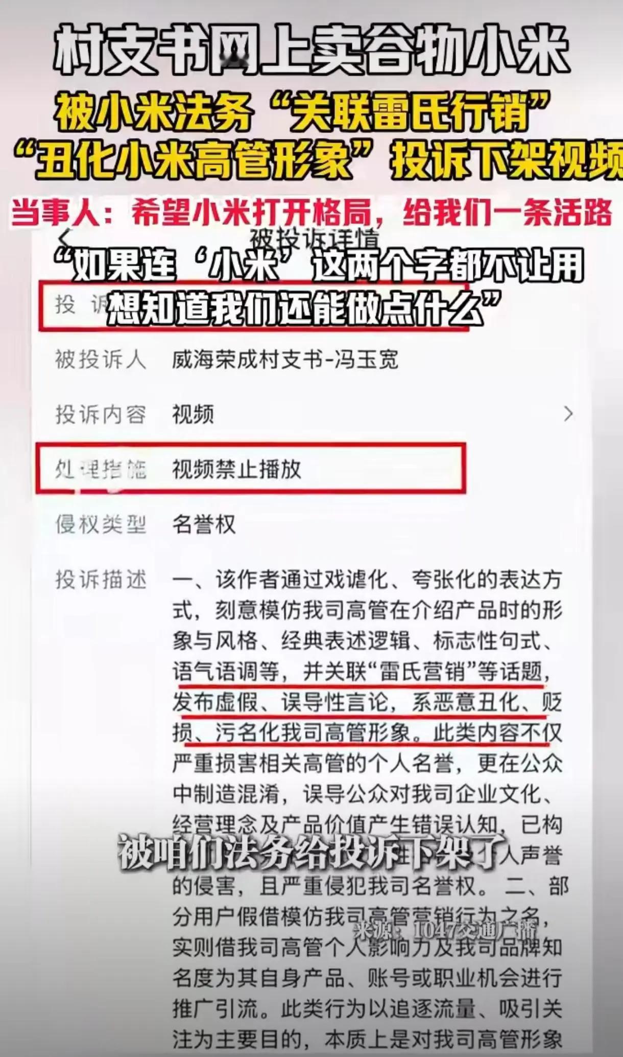 离谱! 村支书卖小米遭投诉,2025年12月12日热议。 谁能想到,地里长了千年的小米,会让一位村支书对着镜头鞠躬道歉?山东威海的冯玉宽只是想帮村民卖掉滞销的粮食,拍了几条朴实的带货视频,就被小米公司法务以“商标侵权”“丑化高管”为由投诉下架,前期积累的订单和流量一夜清零,村民们的期待落了空。这场“农作物小米”与“科技小米”的碰撞,看似是维权纠纷,实则戳破了一个更尖锐的问题:当商业规则遇上民生底线,大企业的“权利边界”该划在哪里? 先把事件来龙去脉理清楚。西初家村的小米颗粒饱满,却因地处偏远年年滞销,身为村支书的冯玉宽急在心里。2025年11月,他学着拍短视频直播,镜头里没有华丽包装,只有晾晒的谷穗和实在的讲解,很快吸引了网友关注。可就在销量刚有起色时,平台突然发来下架通知——投诉方是小米公司,理由离谱到让人咋舌:不仅说“小米”是其注册商标,还指控冯玉宽“蹭雷军热度”“模仿高管形象”,甚至扣上“丑化品牌”的帽子。一头雾水的冯玉宽反复解释无果,只能红着眼鞠躬道歉,把宣传话术里的“小米”改成“本地谷子”,才勉强恢复带货。 最关键的是,小米公司的维权站不住脚。从法律上讲,《商标法》明确规定,商标权人不能禁止他人对通用名称的正当使用。“小米”作为谷物名称沿用千年,就像“苹果”可以指水果、“大米”能叫粮食一样,本就是公众共用的词汇。冯玉宽在直播里清清楚楚标注“农产品小米”,全程没提手机、汽车,消费者根本不可能混淆,何来“侵权”一说?更别提他一分差价不赚,所有收入全归村民,这是纯粹的公益助农,跟“恶意营销”没有半毛钱关系。 网友的愤怒恰恰源于这份“理亏的维权”。还让不让人卖小米了话题冲上热搜,有人质问“企业注册商标就能垄断千年粮食名?”,有人吐槽“科技巨头何苦为难种粮农民”。要知道,这不是小米第一次“过度维权”,此前“小米板鸭店”“小米汽车维修厂”都遭过投诉,连纸扎版“小米SU7”祭祀品都被威胁,这种“万物皆可告”的操作,早已暴露了其滥用商标权的倾向。法律专家说得好:“若连‘小米’都不能叫,农民的生计谁来保障?” 更值得深思的是,冯玉宽的遭遇不是个例。乡村助农者大多缺乏品牌意识和法律知识,土特产沿用通用名称,稍有不慎就可能触碰“红线”;加上基层缺专业法律指导,遇到投诉只能被动妥协,甚至还会被“职业打假人”盯上。但这绝不是大企业“趁虚而入”的理由。维权无可厚非,可保护商标的前提是“正当”,把法律武器对准为村民谋生计的基层干部,把千年通用名称当成“专属资产”,这不是维权,是仗着实力强欺负弱势群体。 小米公司总说要做“有温度的企业”,可这次的操作满是傲慢。乡村振兴本就需要更多冯玉宽这样放下身份办实事的基层干部,需要互联网给土特产打开销路,大企业本该搭把手,而非筑起高墙。正如网友说的:“乡村振兴的蓝图里,不该容不下几亩小米田”。 最后想说一句:商标可以注册,但良知不能垄断;规则需要遵守,但温度不该缺席。冯玉宽改了话术,可还有无数乡村助农者可能踩进同样的坑。希望这场纠纷能敲醒所有大企业:维权要有边界,别让“合法权利”变成“霸权工具”,否则赢了官司,输的是人心。你觉得小米公司该道歉吗?欢迎在评论区聊聊。小米