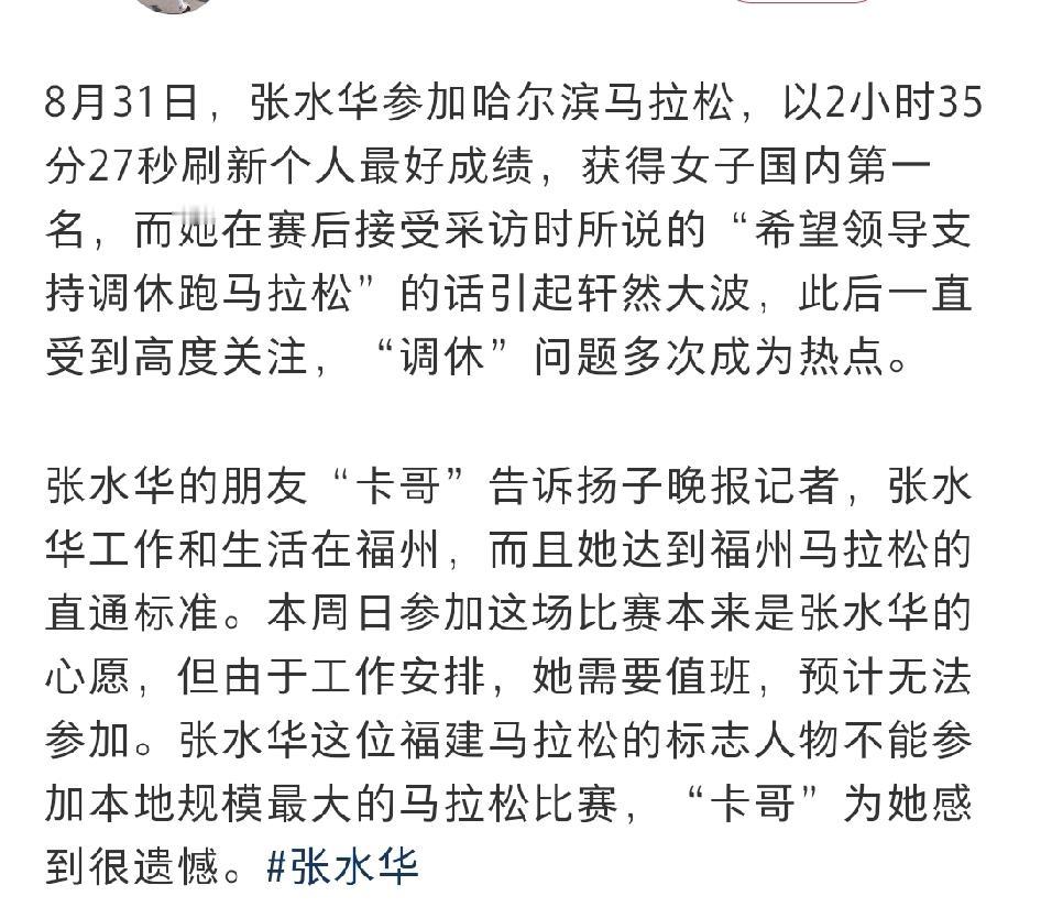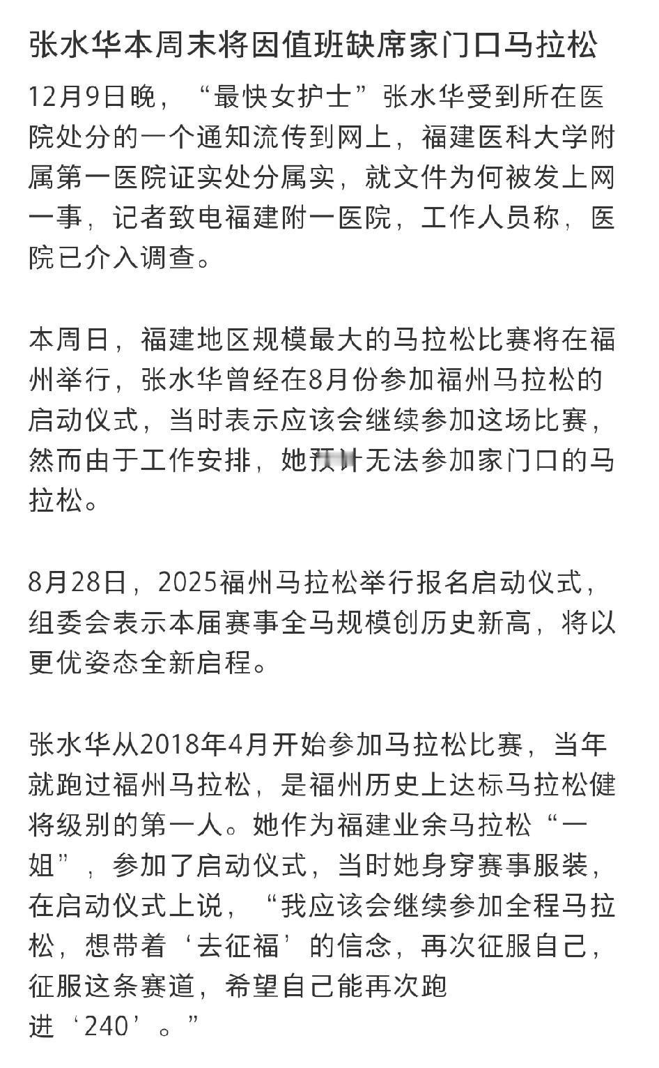 谁之过? “最快护士”张水华将缺席福建本地最大规模的马拉松赛。 这么看来,这是三输的局面: 1、组委会,因为张水华没有参加,赛事就不够完美,人气也必然下降。 2、张水华个人,可能会成为她一辈子的遗憾。 3、医院方面,少了一次荣誉,而且可能会遭到张水华粉丝的非议。 那么,是什么造成了各方不愿意看到的局面呢?
